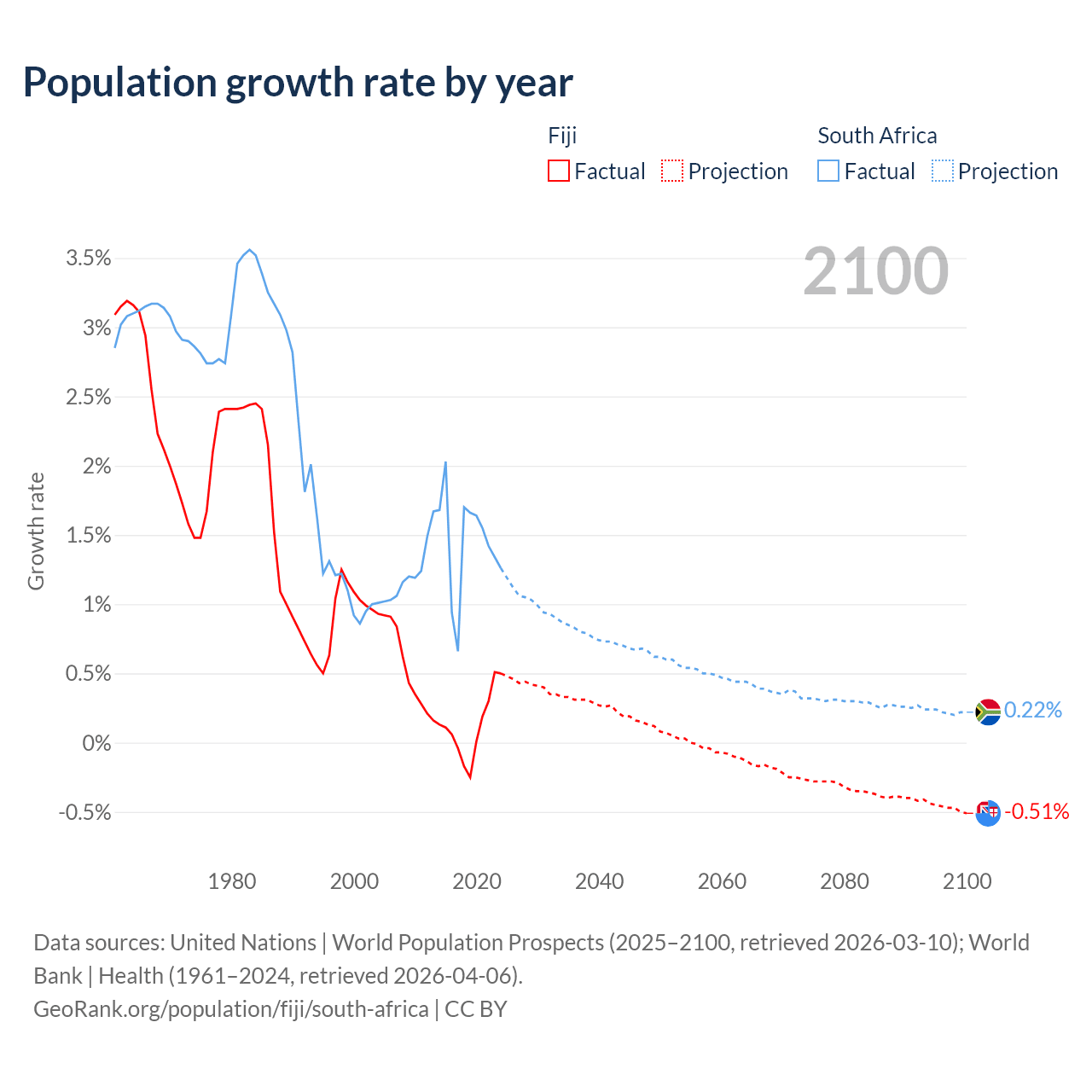 - For the last 10 years, Fiji has had an average growth rate of +0.12% per year vs +1.44% in South Africa.