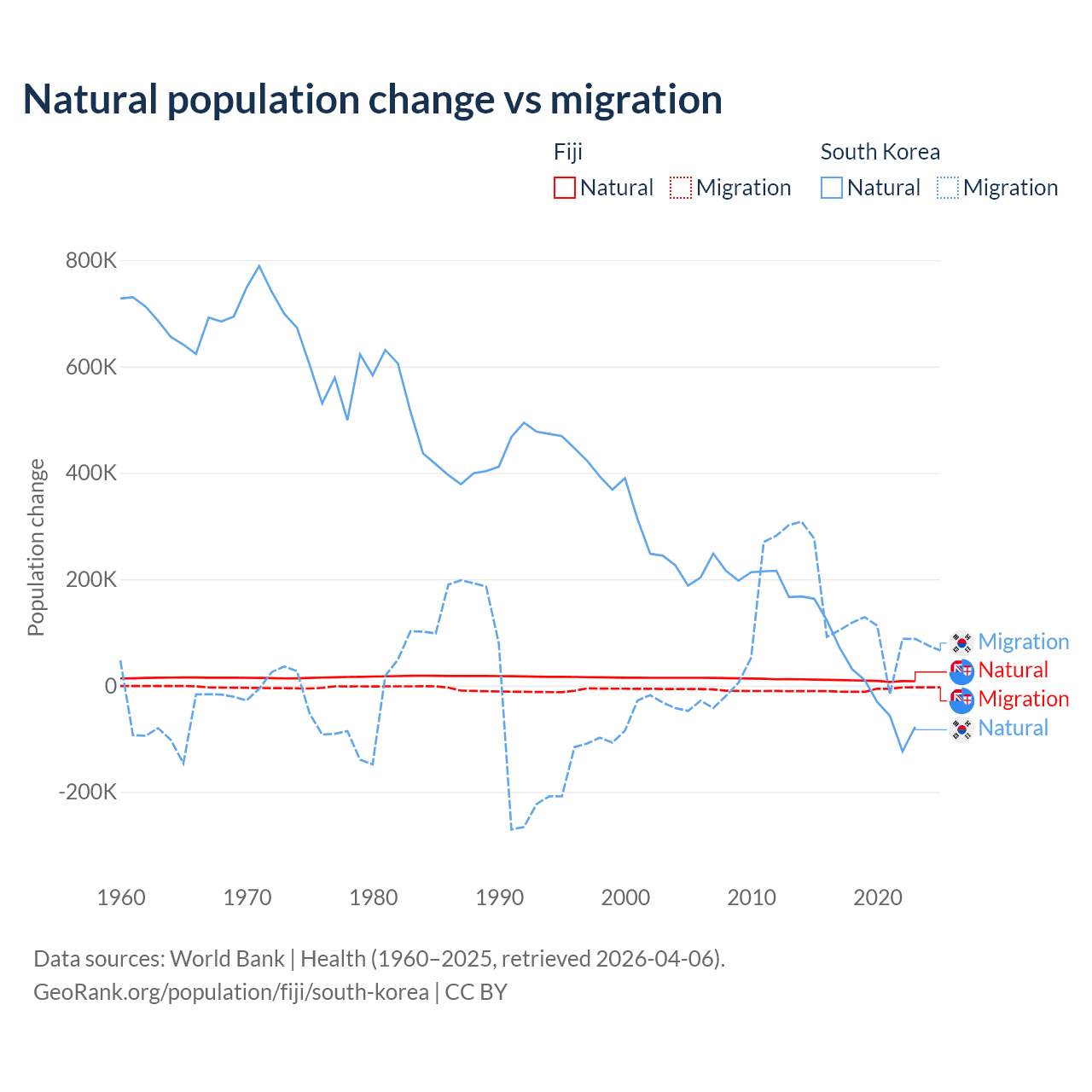Over the last 10 years, 52.6% of the population change in Fiji is from natural causes (a gain of 94,971 people) and 47.4% is from migration (a loss of 85,415 people). In South Korea 17.6% is from natural causes (a gain of 277,215 people) and 82.4% is from migration (a gain of 1,298,356 people).