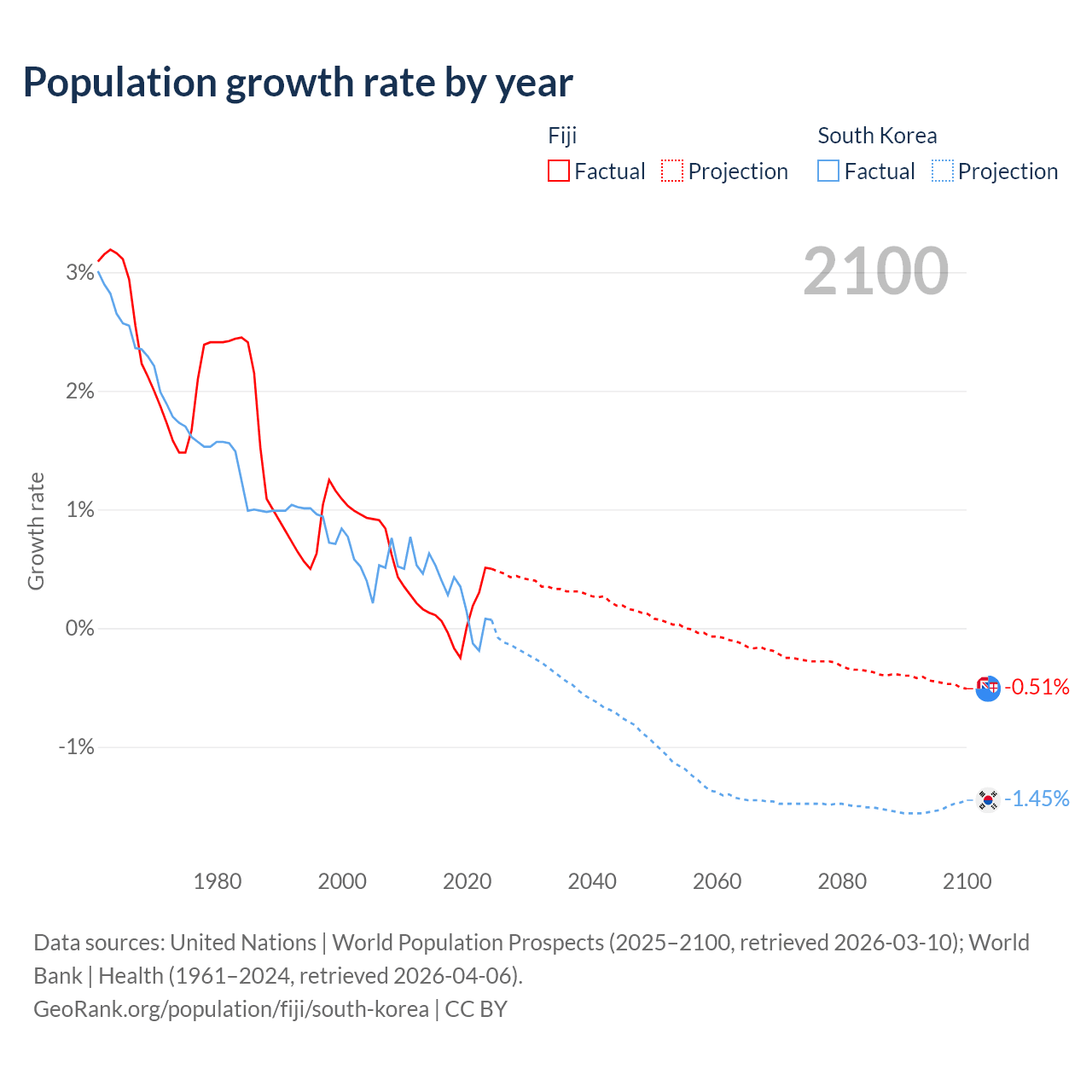 - For the last 10 years, Fiji has had an average growth rate of +0.12% per year vs +0.24% in South Korea.