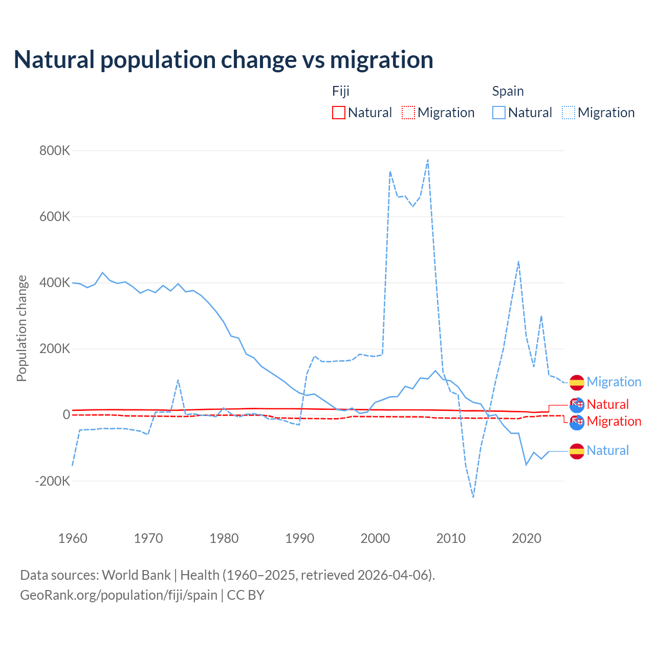 Over the last 10 years, 52.6% of the population change in Fiji is from natural causes (a gain of 94,971 people) and 47.4% is from migration (a loss of 85,415 people). In Spain 25.8% is from natural causes (a loss of 627,829 people) and 74.2% is from migration (a gain of 1,810,127 people).