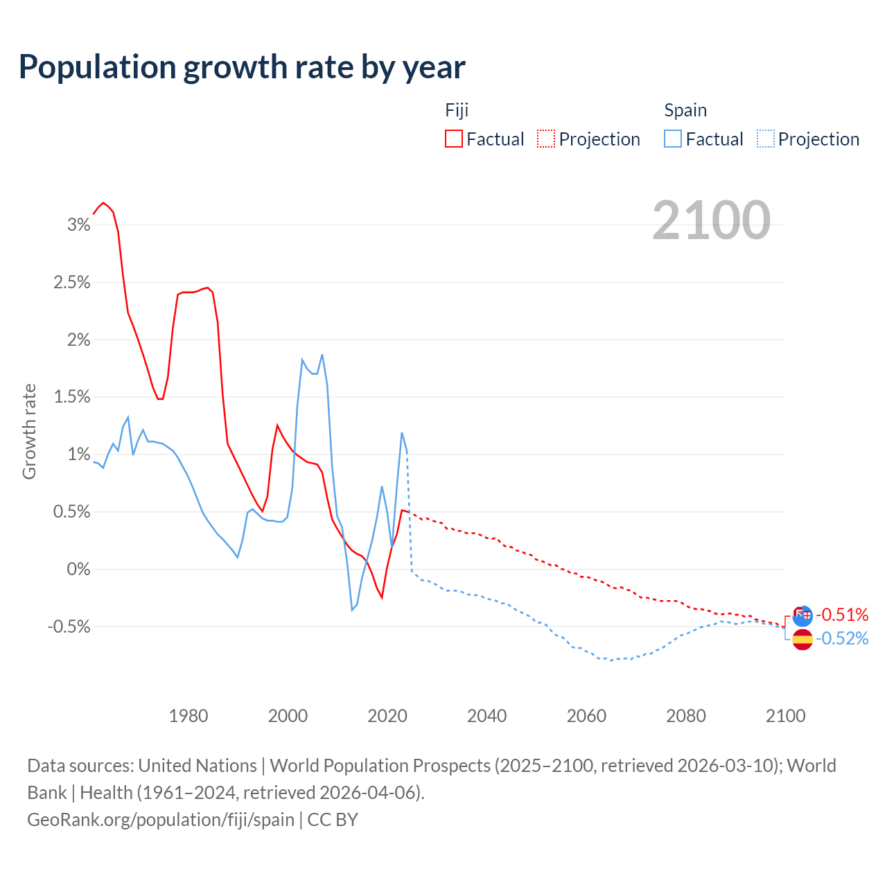 - For the last 10 years, Fiji has had an average growth rate of +0.12% per year vs +0.43% in Spain.