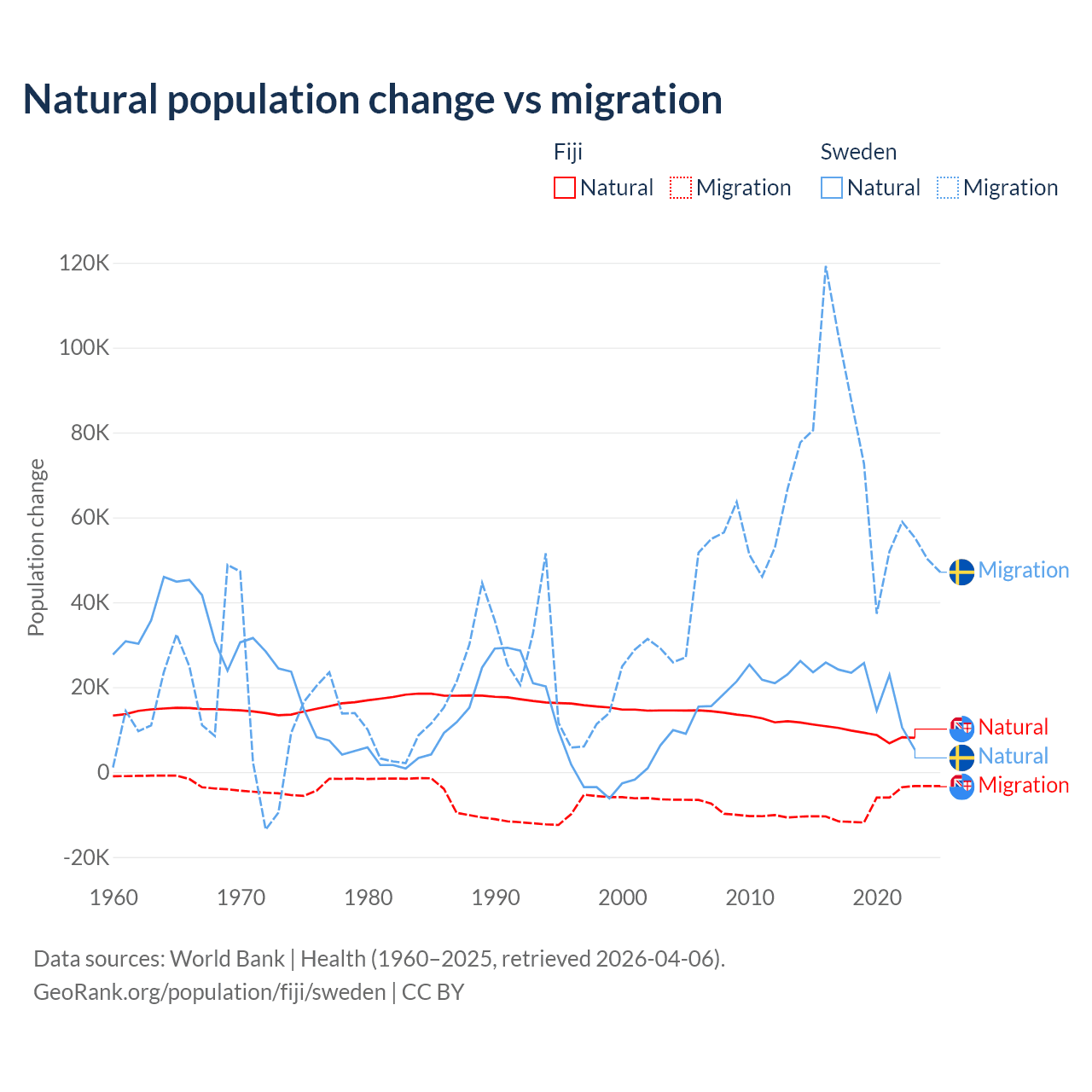 Over the last 10 years, 52.6% of the population change in Fiji is from natural causes (a gain of 94,971 people) and 47.4% is from migration (a loss of 85,415 people). In Sweden 21.4% is from natural causes (a gain of 201,900 people) and 78.6% is from migration (a gain of 743,642 people).