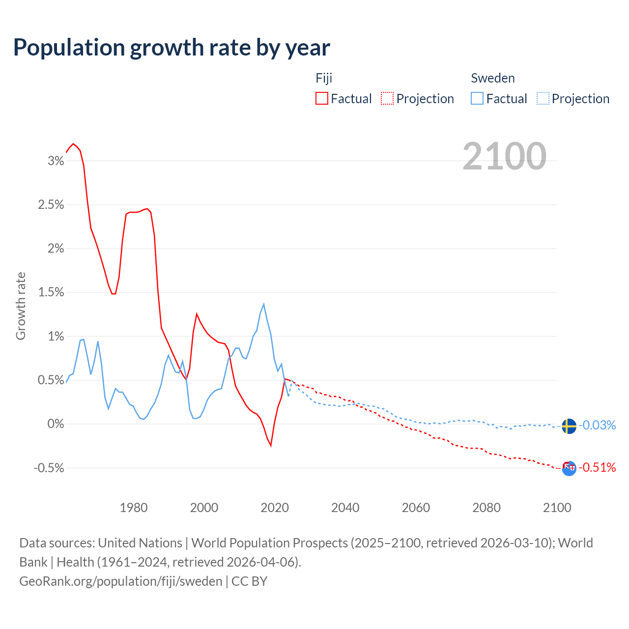 - For the last 10 years, Fiji has had an average growth rate of +0.12% per year vs +0.88% in Sweden.