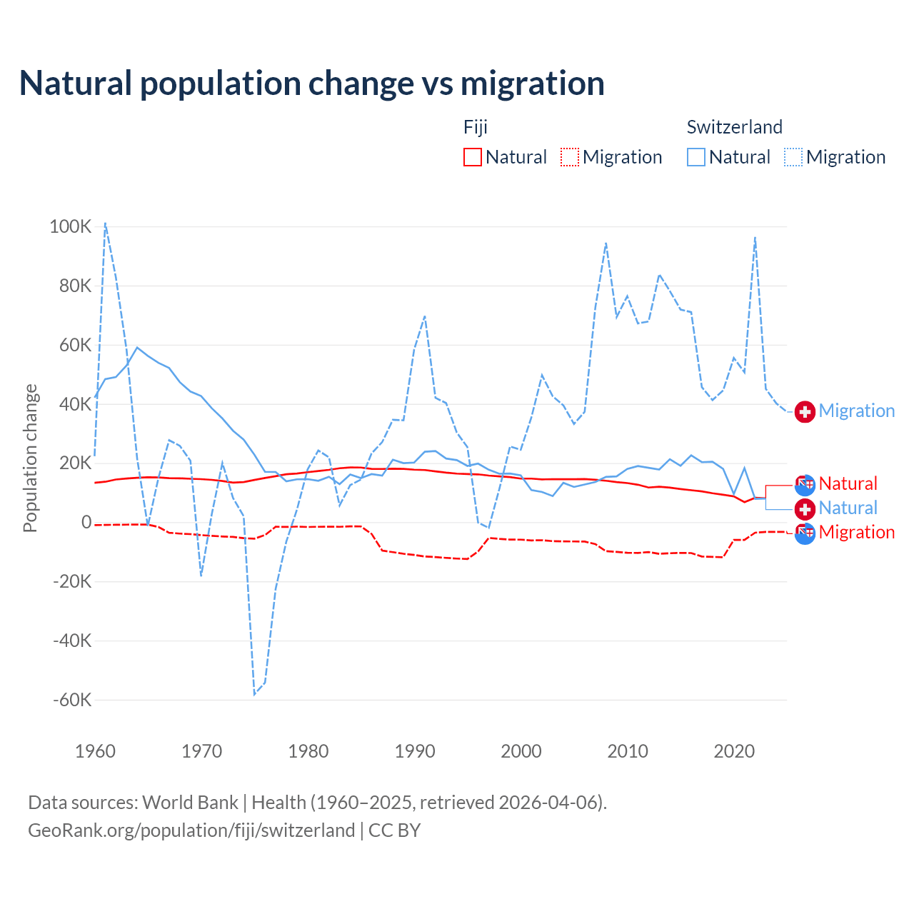 Over the last 10 years, 52.6% of the population change in Fiji is from natural causes (a gain of 94,971 people) and 47.4% is from migration (a loss of 85,415 people). In Switzerland 21.6% is from natural causes (a gain of 165,354 people) and 78.4% is from migration (a gain of 600,145 people).