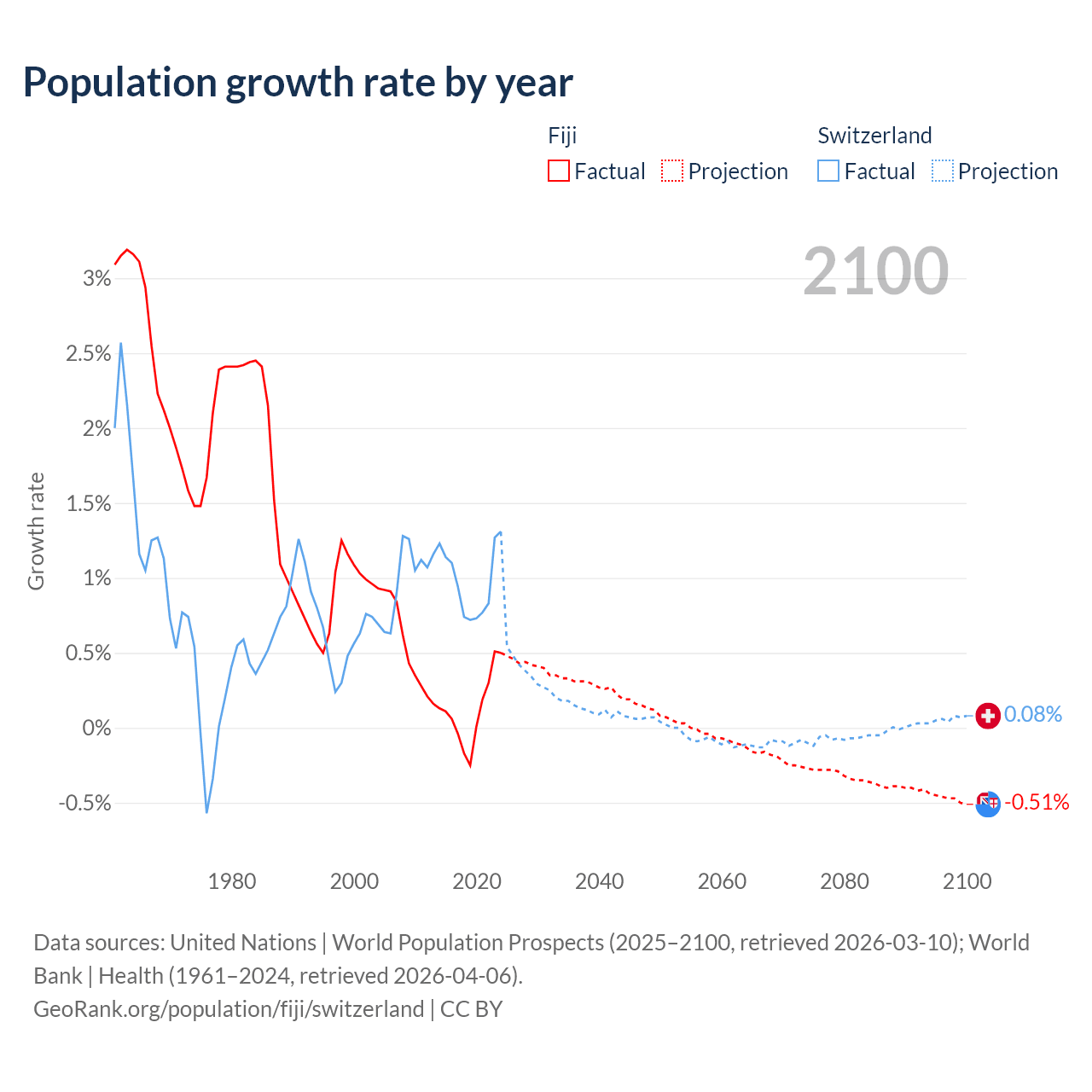 - For the last 10 years, Fiji has had an average growth rate of +0.12% per year vs +0.98% in Switzerland.
