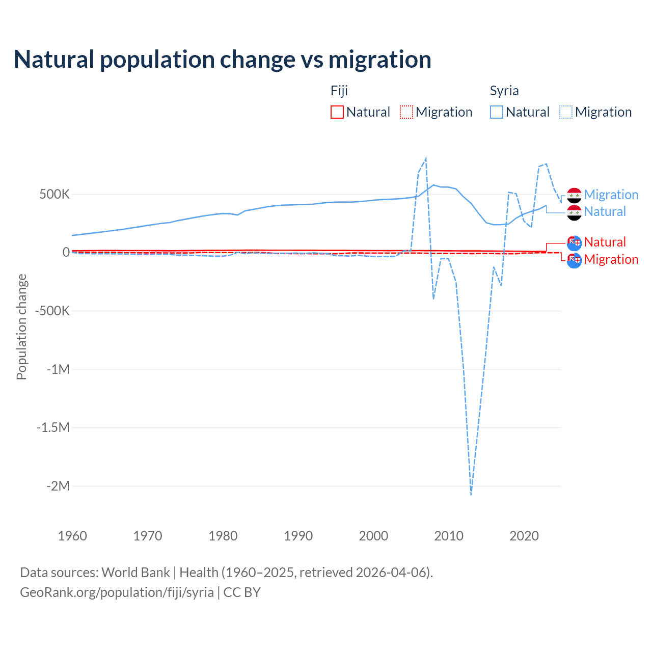 Over the last 10 years, 52.6% of the population change in Fiji is from natural causes (a gain of 94,971 people) and 47.4% is from migration (a loss of 85,415 people). In Syria 91.3% is from natural causes (a gain of 3,047,621 people) and 8.72% is from migration (a gain of 291,069 people).