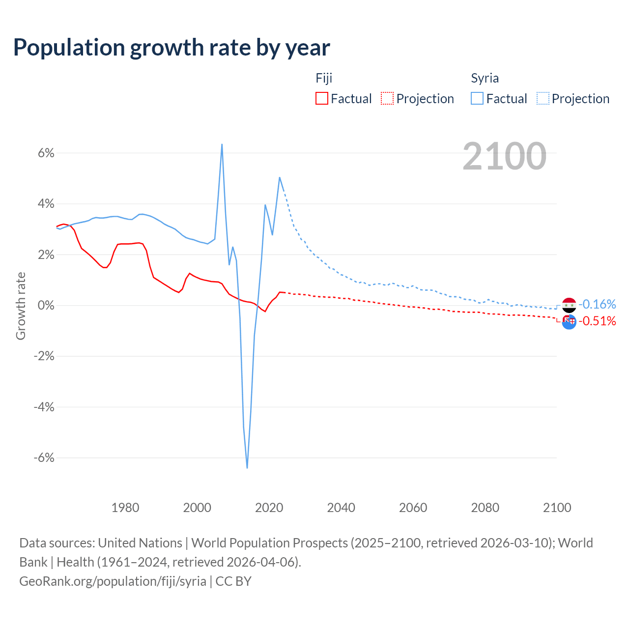 - For the last 10 years, Fiji has had an average growth rate of +0.12% per year vs +1.25% in Syria.