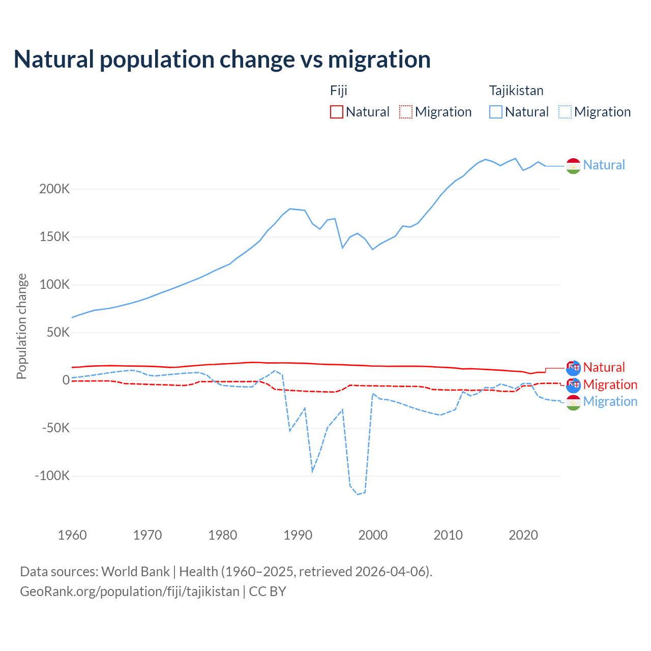 Over the last 10 years, 52.6% of the population change in Fiji is from natural causes (a gain of 94,971 people) and 47.4% is from migration (a loss of 85,415 people). In Tajikistan 96% is from natural causes (a gain of 2,266,045 people) and 3.95% is from migration (a loss of 93,205 people).