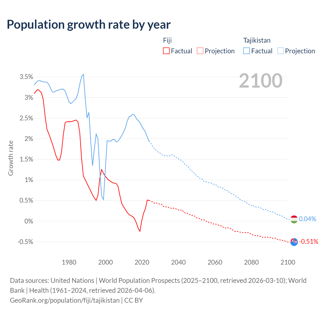 - For the last 10 years, Fiji has had an average growth rate of +0.12% per year vs +2.33% in Tajikistan.
