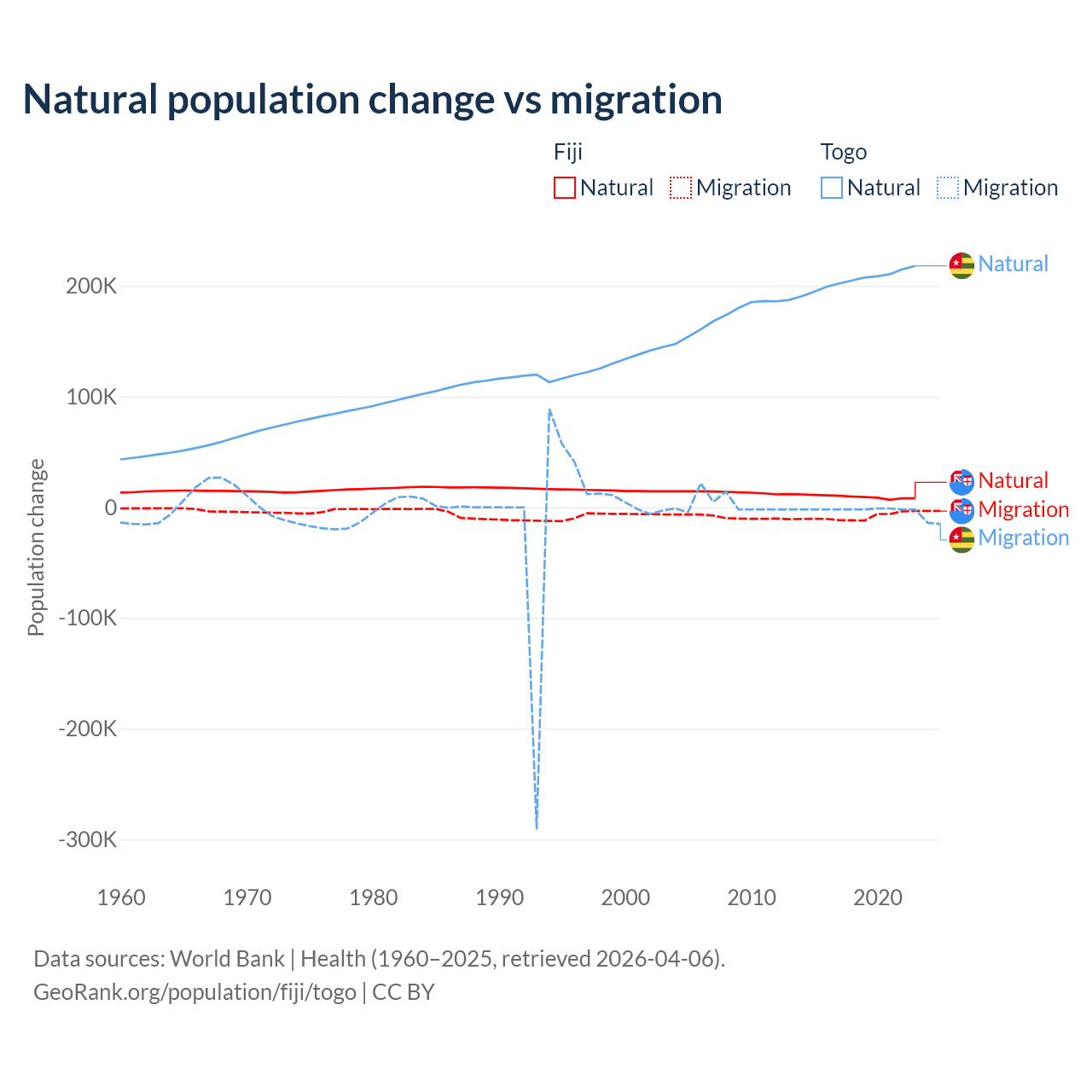 Over the last 10 years, 52.6% of the population change in Fiji is from natural causes (a gain of 94,971 people) and 47.4% is from migration (a loss of 85,415 people). In Togo 99.1% is from natural causes (a gain of 2,052,115 people) and 0.86% is from migration (a loss of 17,852 people).