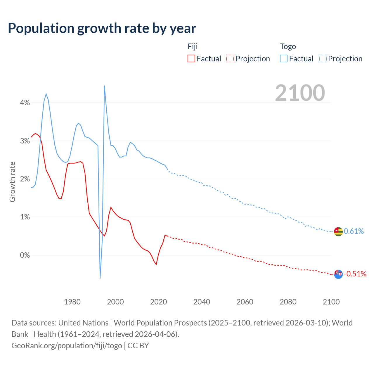 - For the last 10 years, Fiji has had an average growth rate of +0.12% per year vs +2.46% in Togo.