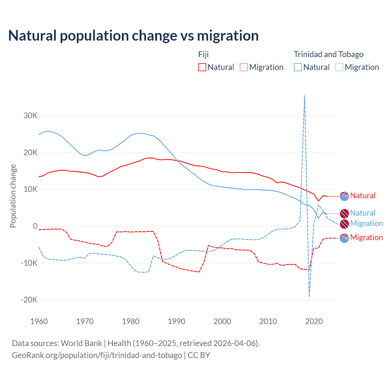 Over the last 10 years, 52.6% of the population change in Fiji is from natural causes (a gain of 94,971 people) and 47.4% is from migration (a loss of 85,415 people). In Trinidad and Tobago 66% is from natural causes (a gain of 55,887 people) and 34% is from migration (a gain of 28,785 people).