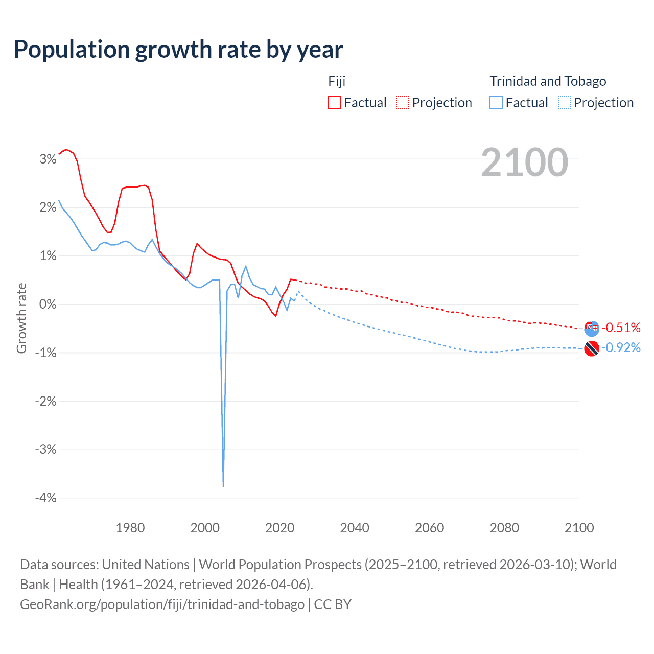 - For the last 10 years, Fiji has had an average growth rate of +0.12% per year vs +0.19% in Trinidad and Tobago.