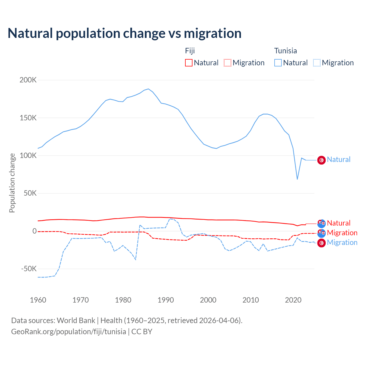 Over the last 10 years, 52.6% of the population change in Fiji is from natural causes (a gain of 94,971 people) and 47.4% is from migration (a loss of 85,415 people). In Tunisia 86.3% is from natural causes (a gain of 1,225,079 people) and 13.7% is from migration (a loss of 195,011 people).