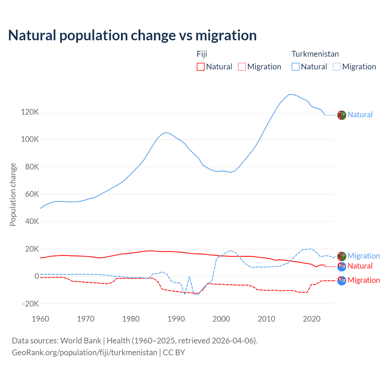 Over the last 10 years, 52.6% of the population change in Fiji is from natural causes (a gain of 94,971 people) and 47.4% is from migration (a loss of 85,415 people). In Turkmenistan 89.2% is from natural causes (a gain of 1,270,228 people) and 10.8% is from migration (a gain of 154,379 people).