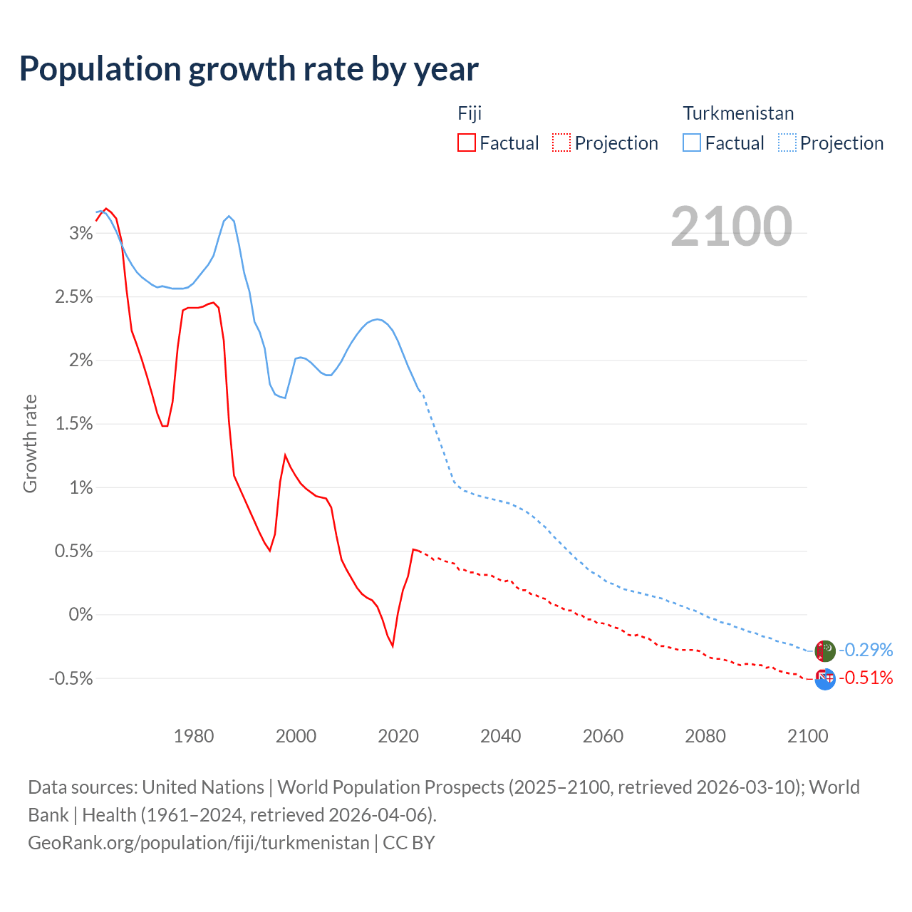 - For the last 10 years, Fiji has had an average growth rate of +0.12% per year vs +2.14% in Turkmenistan.
