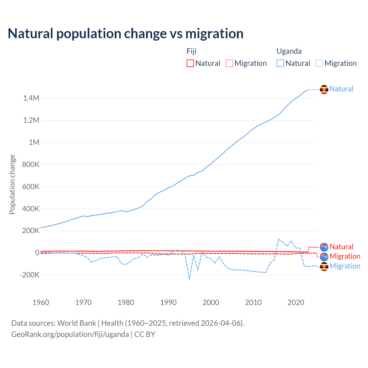 Over the last 10 years, 52.6% of the population change in Fiji is from natural causes (a gain of 94,971 people) and 47.4% is from migration (a loss of 85,415 people). In Uganda 99.5% is from natural causes (a gain of 13,419,712 people) and 0.53% is from migration (a gain of 71,457 people).