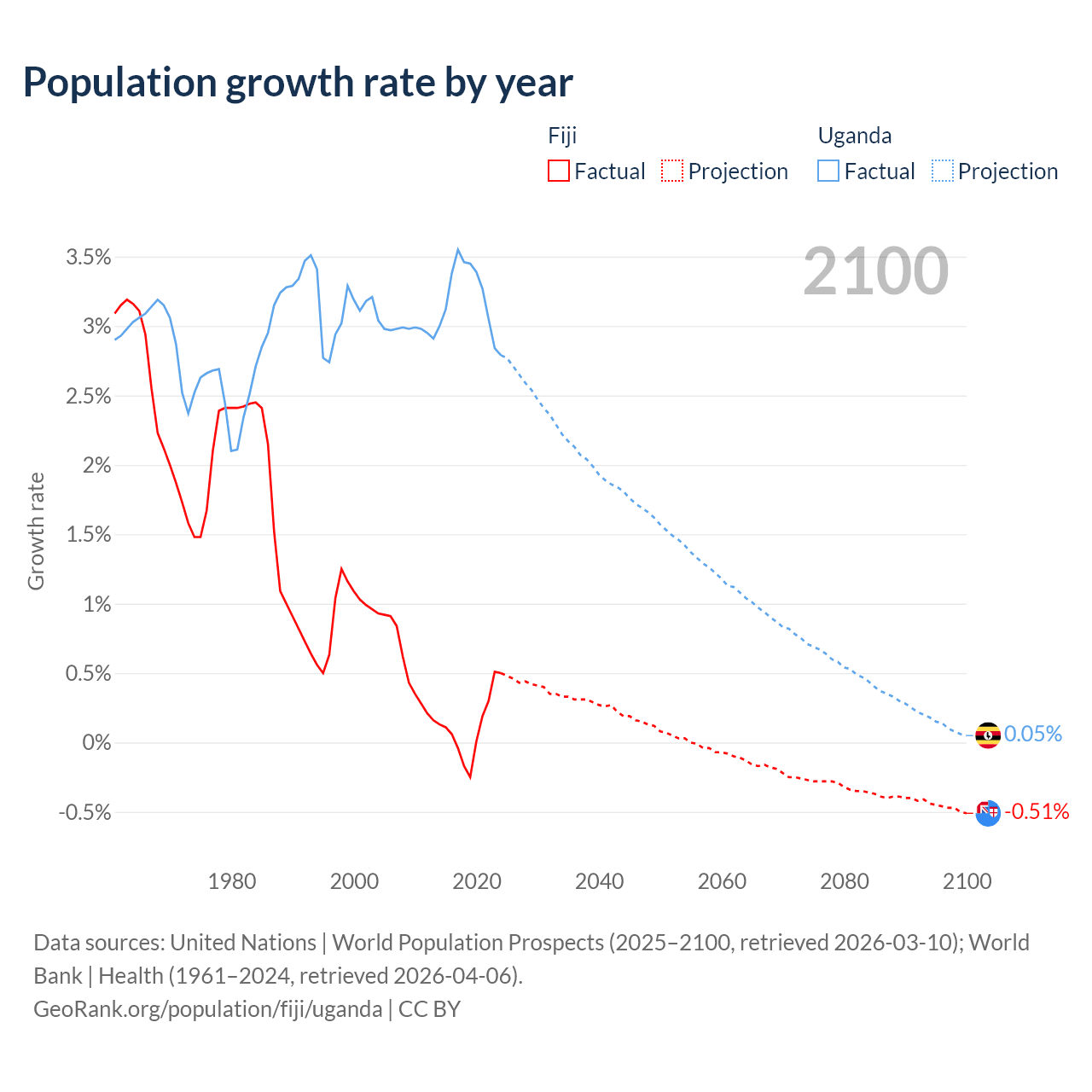 - For the last 10 years, Fiji has had an average growth rate of +0.12% per year vs +3.21% in Uganda.