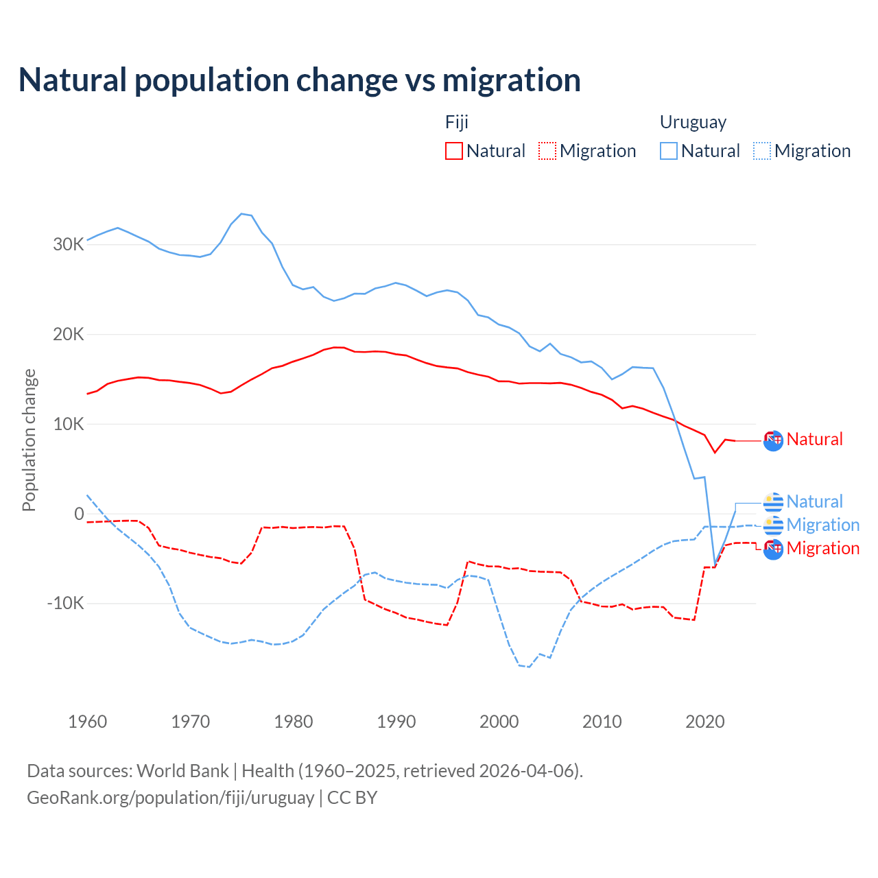 Over the last 10 years, 52.6% of the population change in Fiji is from natural causes (a gain of 94,971 people) and 47.4% is from migration (a loss of 85,415 people). In Uruguay 70% is from natural causes (a gain of 64,303 people) and 30% is from migration (a loss of 27,501 people).