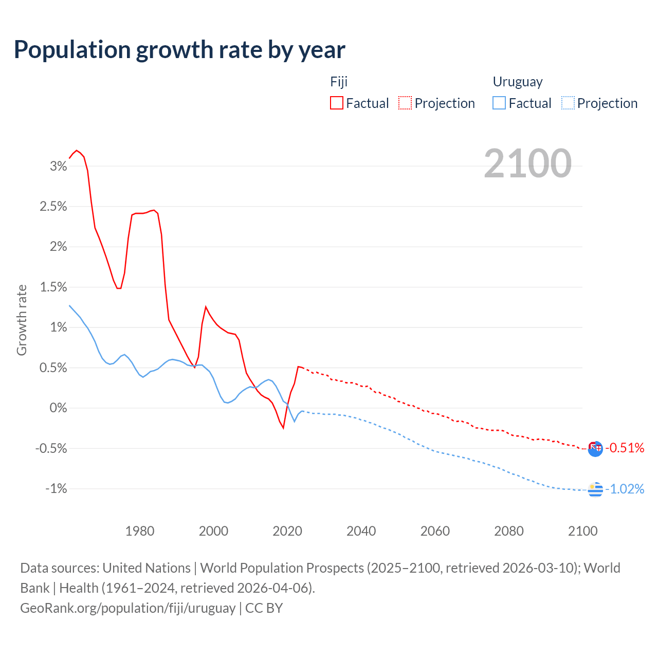 - For the last 10 years, Fiji has had an average growth rate of +0.12% per year vs +0.11% in Uruguay.