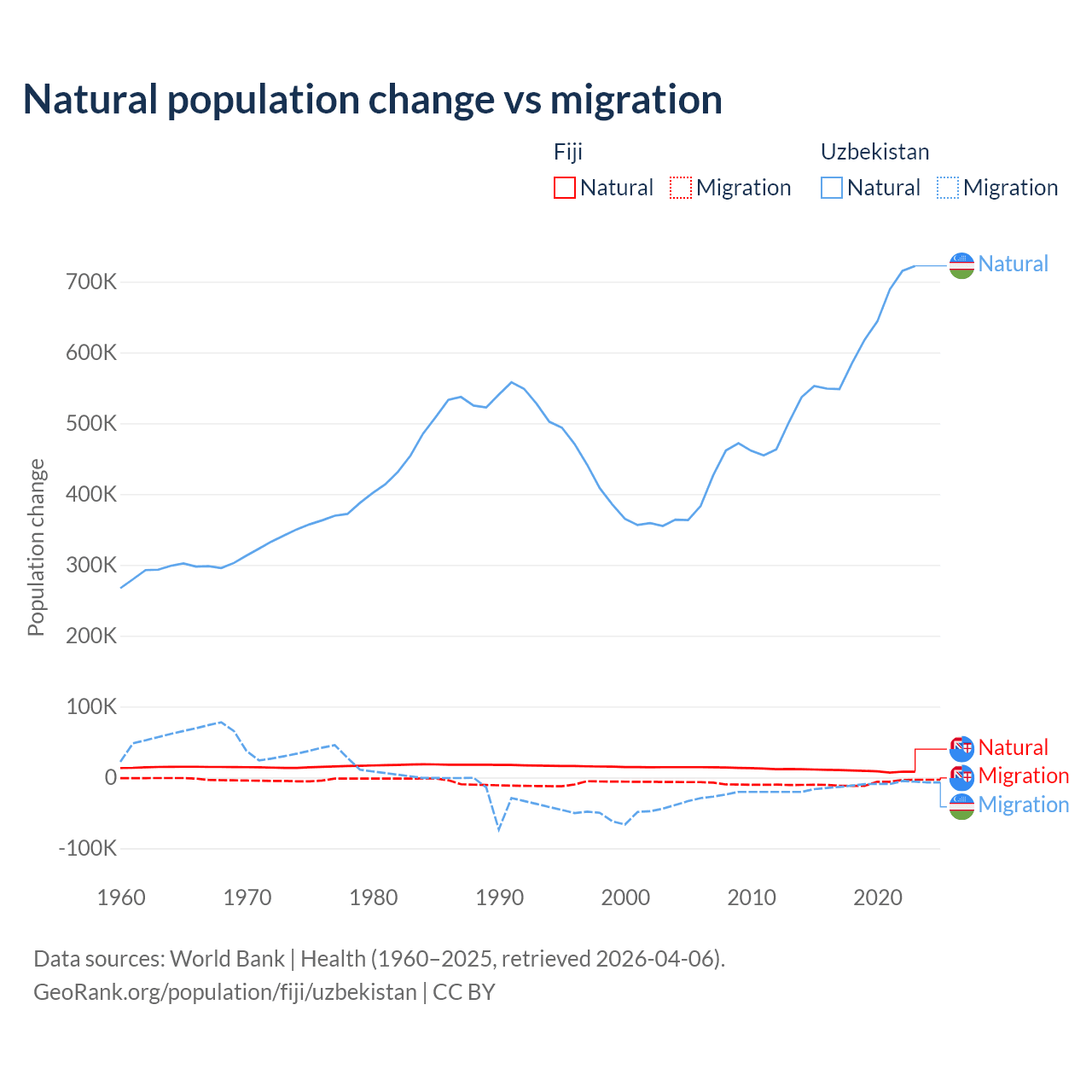 Over the last 10 years, 52.6% of the population change in Fiji is from natural causes (a gain of 94,971 people) and 47.4% is from migration (a loss of 85,415 people). In Uzbekistan 98.2% is from natural causes (a gain of 6,161,117 people) and 1.84% is from migration (a loss of 115,398 people).
