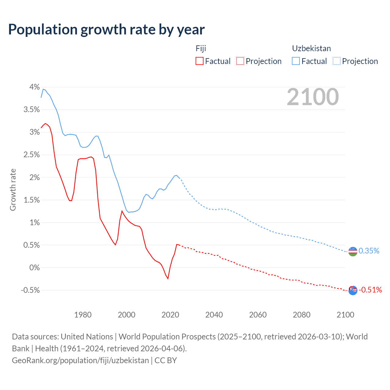 - For the last 10 years, Fiji has had an average growth rate of +0.12% per year vs +1.85% in Uzbekistan.