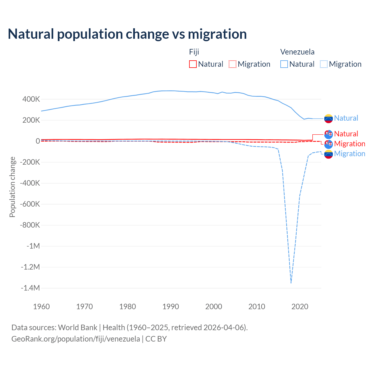 Over the last 10 years, 52.6% of the population change in Fiji is from natural causes (a gain of 94,971 people) and 47.4% is from migration (a loss of 85,415 people). In Venezuela 38.6% is from natural causes (a gain of 2,946,257 people) and 61.4% is from migration (a loss of 4,683,227 people).