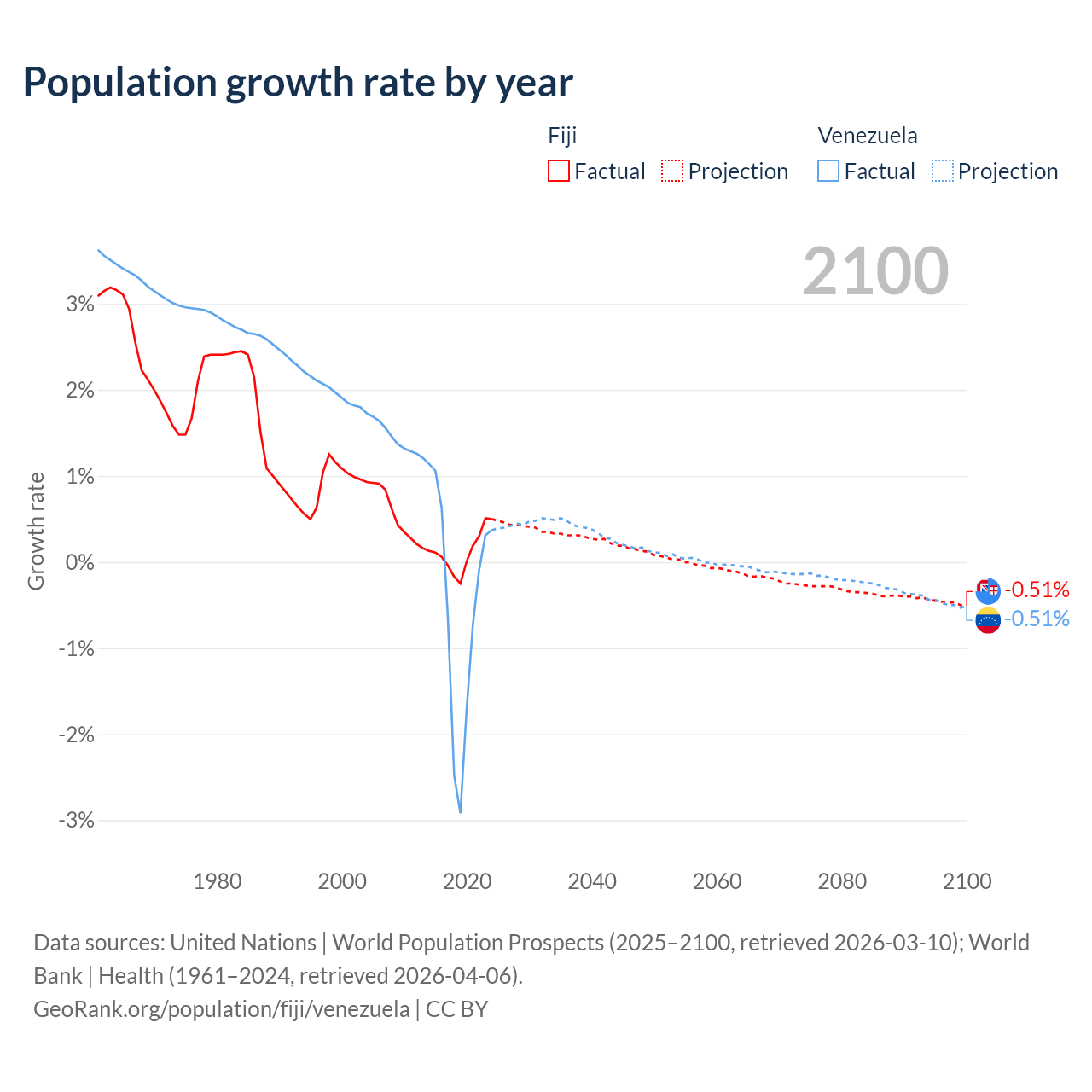 - For the last 10 years, Fiji has had an average growth rate of +0.12% per year vs -0.46% in Venezuela.
