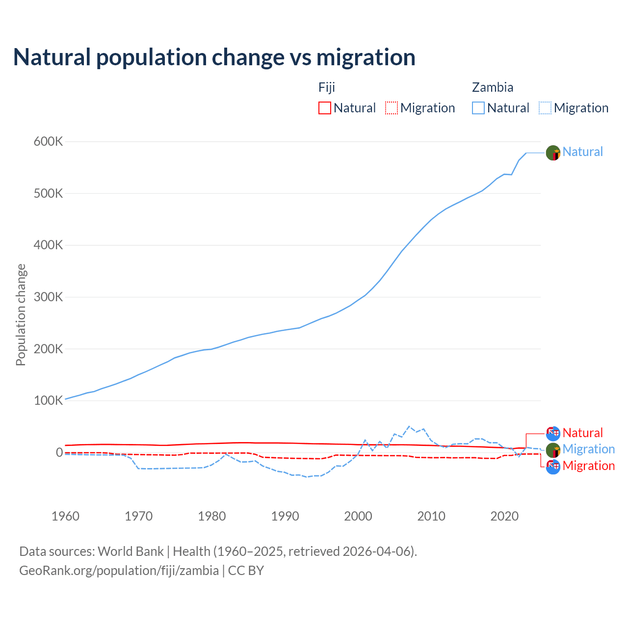 Over the last 10 years, 52.6% of the population change in Fiji is from natural causes (a gain of 94,971 people) and 47.4% is from migration (a loss of 85,415 people). In Zambia 97.4% is from natural causes (a gain of 5,233,797 people) and 2.58% is from migration (a gain of 138,554 people).