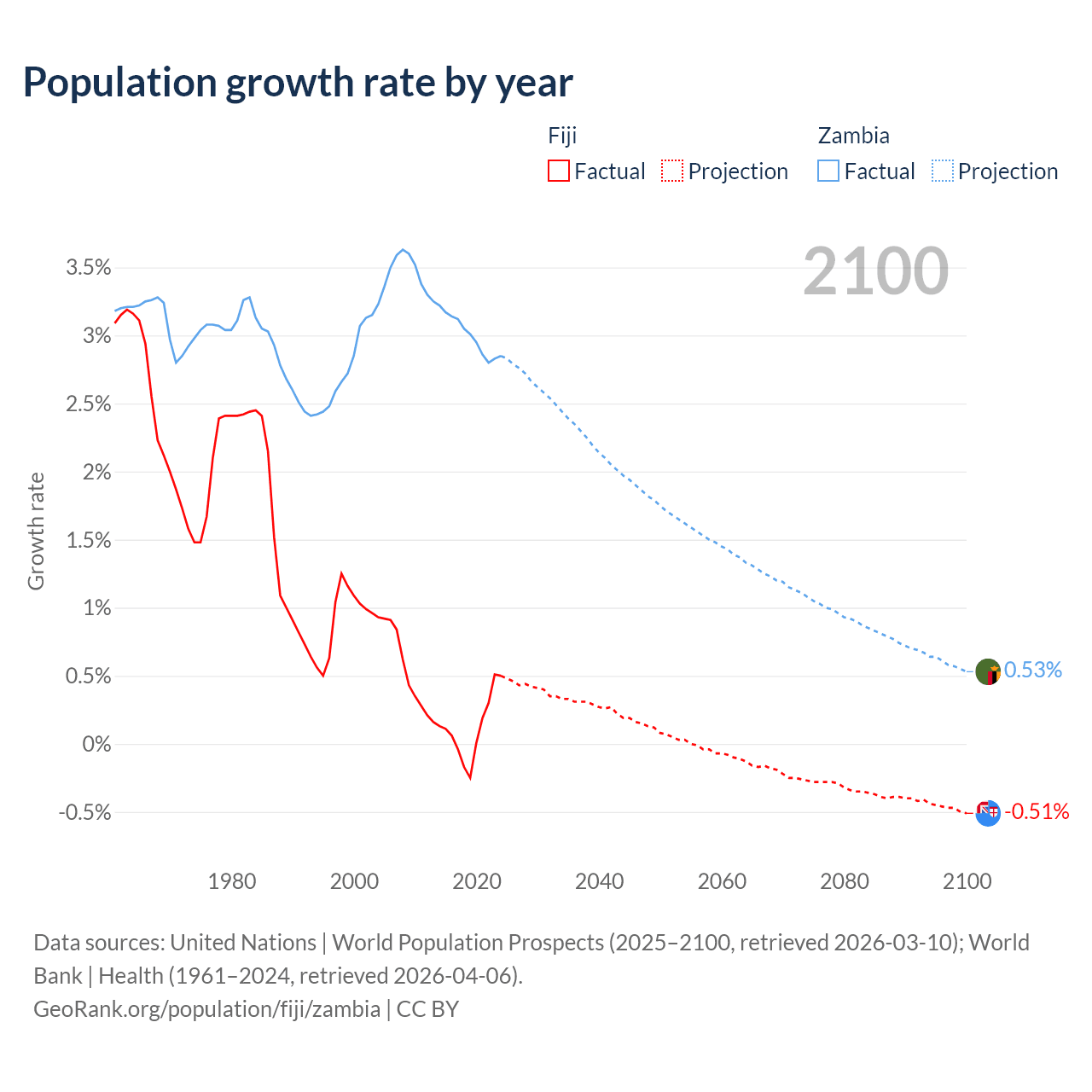 - For the last 10 years, Fiji has had an average growth rate of +0.12% per year vs +3% in Zambia.
