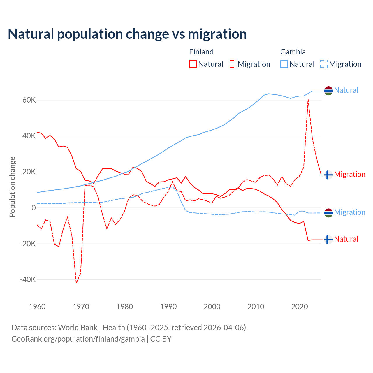Over the last 10 years, 22.5% of the population change in Finland is from natural causes (a loss of 65,560 people) and 77.5% is from migration (a gain of 225,237 people). In the Gambia 95.2% is from natural causes (a gain of 625,795 people) and 4.75% is from migration (a loss of 31,227 people).