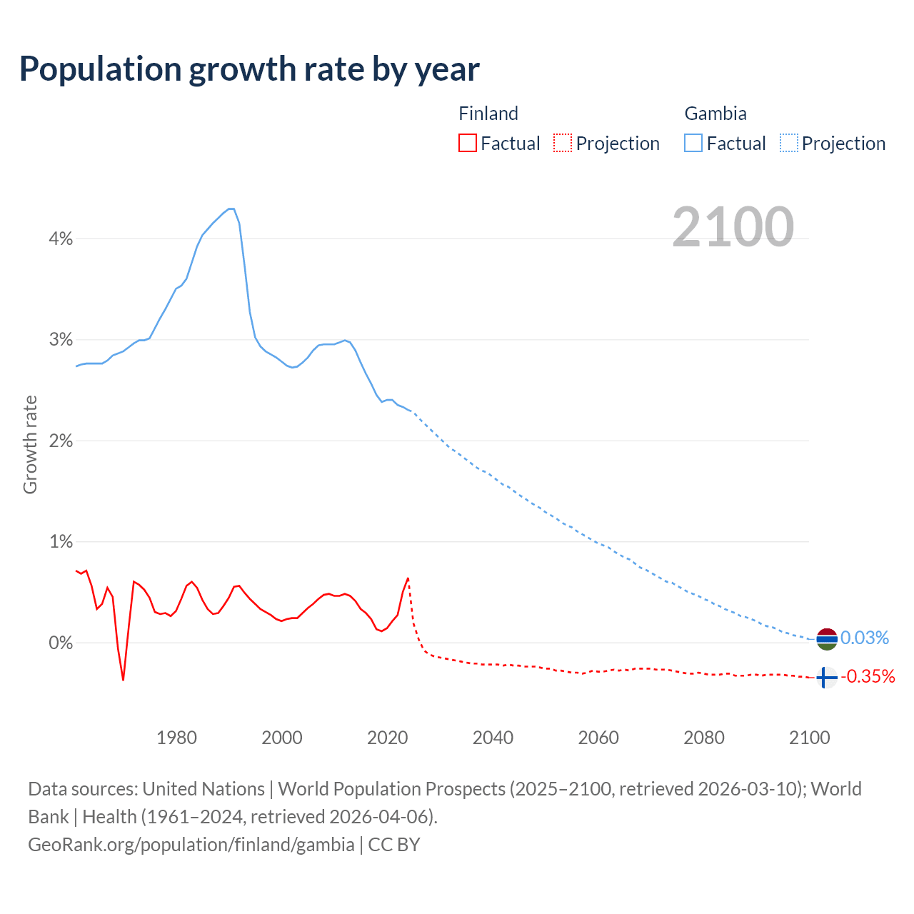 - For the last 10 years, Finland has had an average growth rate of +0.3% per year vs +2.5% in the Gambia.