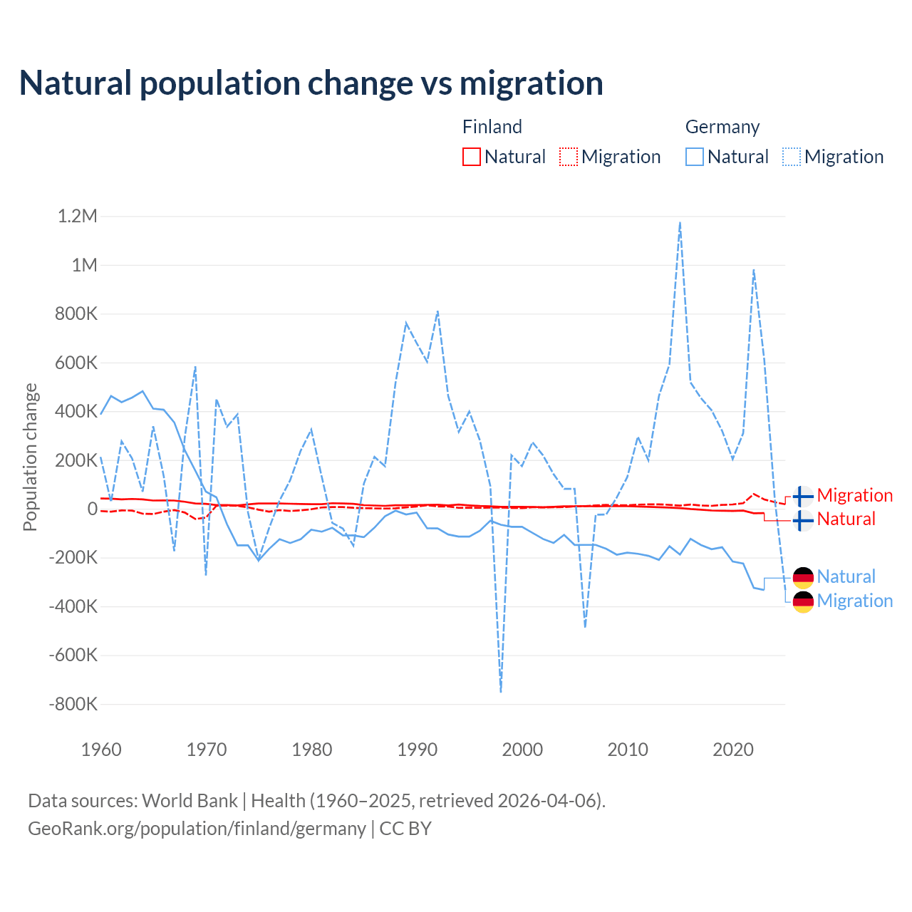Over the last 10 years, 22.5% of the population change in Finland is from natural causes (a loss of 65,560 people) and 77.5% is from migration (a gain of 225,237 people). In Germany 26.8% is from natural causes (a loss of 2,036,130 people) and 73.2% is from migration (a gain of 5,565,916 people).