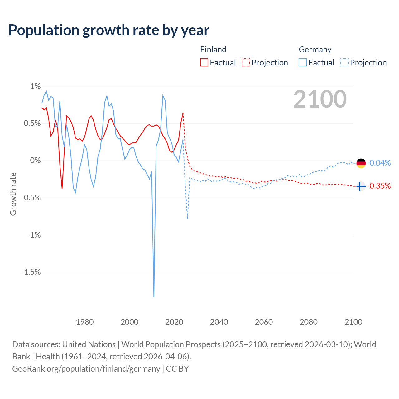 - For the last 10 years, Finland has had an average growth rate of +0.3% per year vs +0.32% in Germany.
