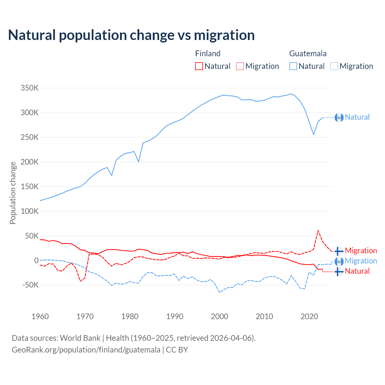 Over the last 10 years, 22.5% of the population change in Finland is from natural causes (a loss of 65,560 people) and 77.5% is from migration (a gain of 225,237 people). In Guatemala 89.8% is from natural causes (a gain of 3,077,847 people) and 10.2% is from migration (a loss of 347,818 people).