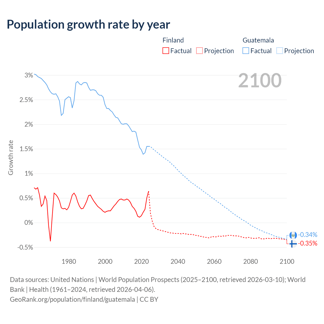 - For the last 10 years, Finland has had an average growth rate of +0.3% per year vs +1.64% in Guatemala.