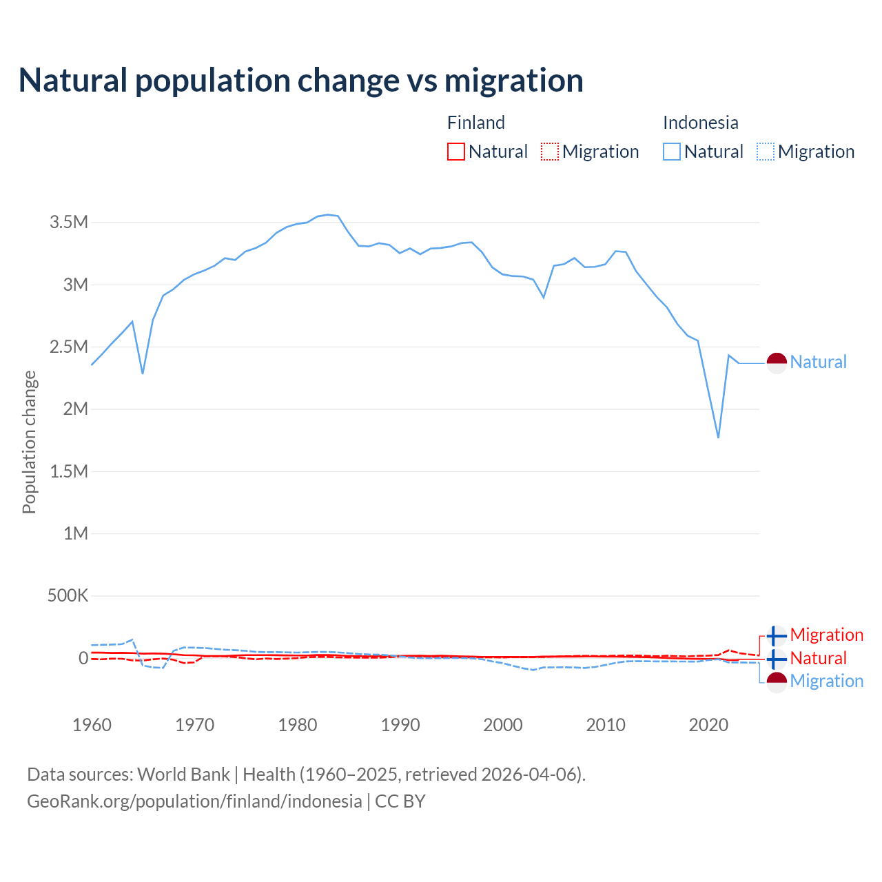 Over the last 10 years, 22.5% of the population change in Finland is from natural causes (a loss of 65,560 people) and 77.5% is from migration (a gain of 225,237 people). In Indonesia 98.9% is from natural causes (a gain of 25,242,860 people) and 1.1% is from migration (a loss of 280,258 people).