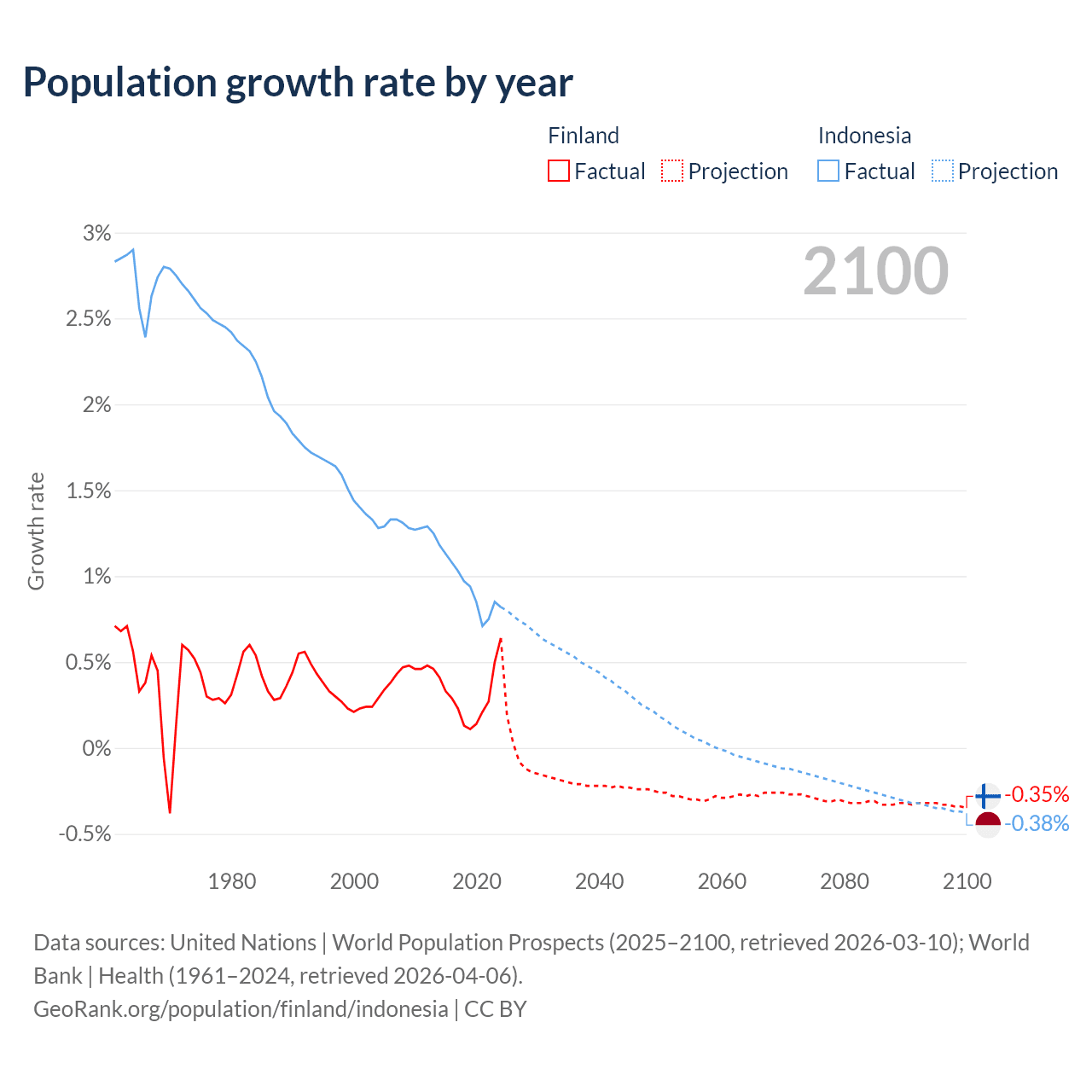 - For the last 10 years, Finland has had an average growth rate of +0.3% per year vs +0.94% in Indonesia.