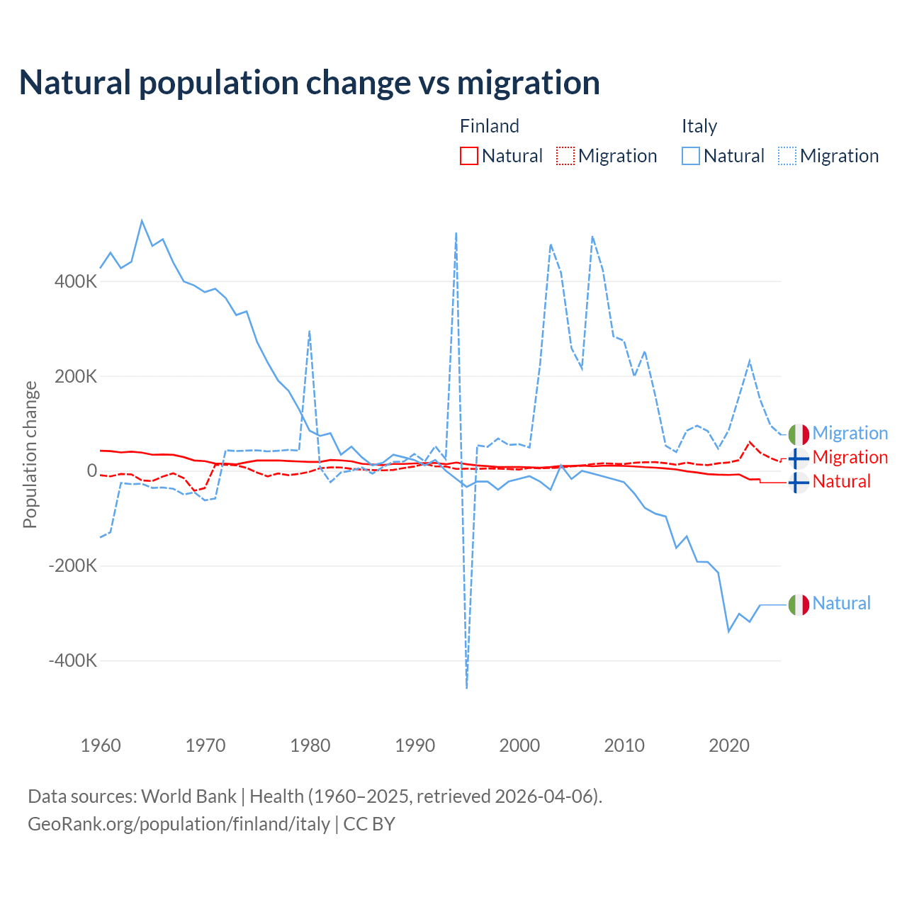 Over the last 10 years, 22.5% of the population change in Finland is from natural causes (a loss of 65,560 people) and 77.5% is from migration (a gain of 225,237 people). In Italy 68.6% is from natural causes (a loss of 2,239,084 people) and 31.4% is from migration (a gain of 1,026,128 people).