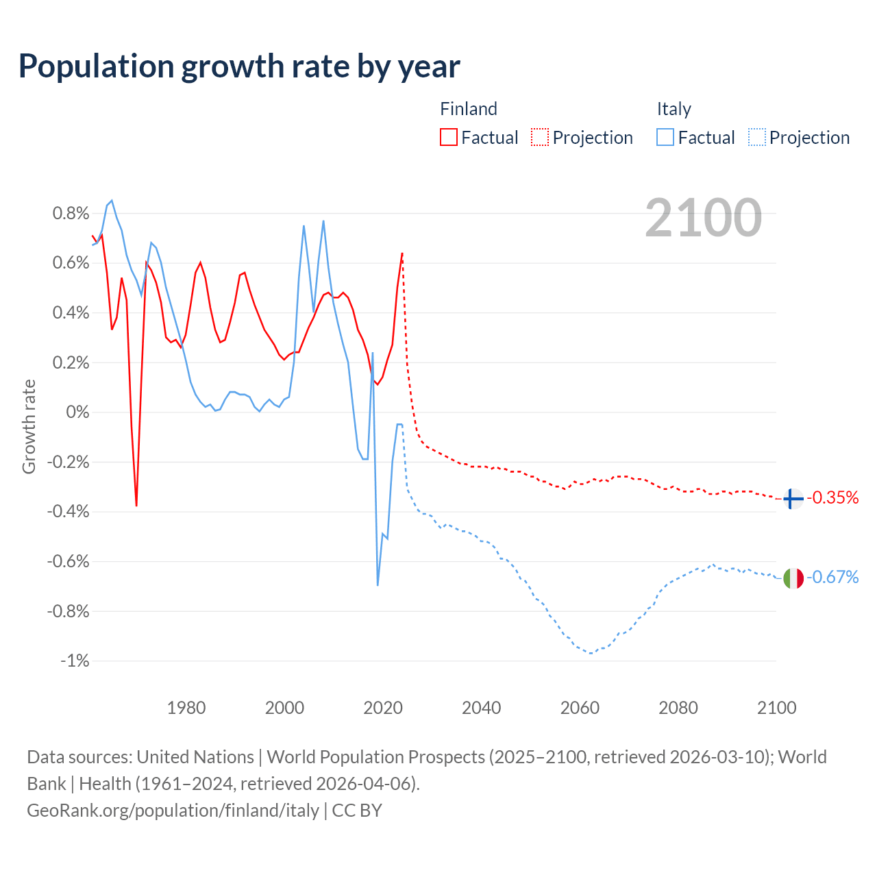- For the last 10 years, Finland has had an average growth rate of +0.3% per year vs -0.21% in Italy.
