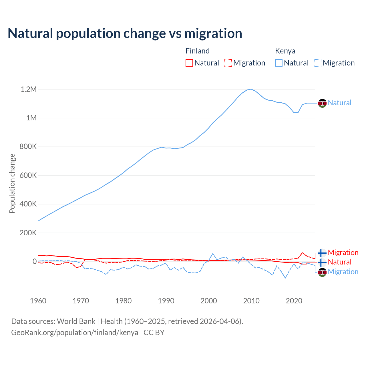 Over the last 10 years, 22.5% of the population change in Finland is from natural causes (a loss of 65,560 people) and 77.5% is from migration (a gain of 225,237 people). In Kenya 95.3% is from natural causes (a gain of 10,892,362 people) and 4.67% is from migration (a loss of 533,876 people).