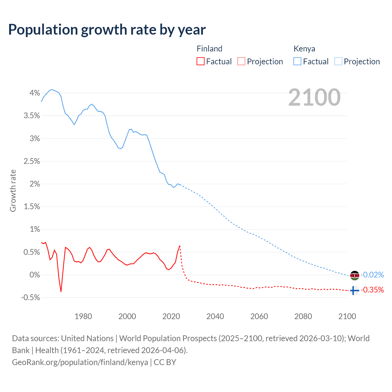 - For the last 10 years, Finland has had an average growth rate of +0.3% per year vs +2.08% in Kenya.