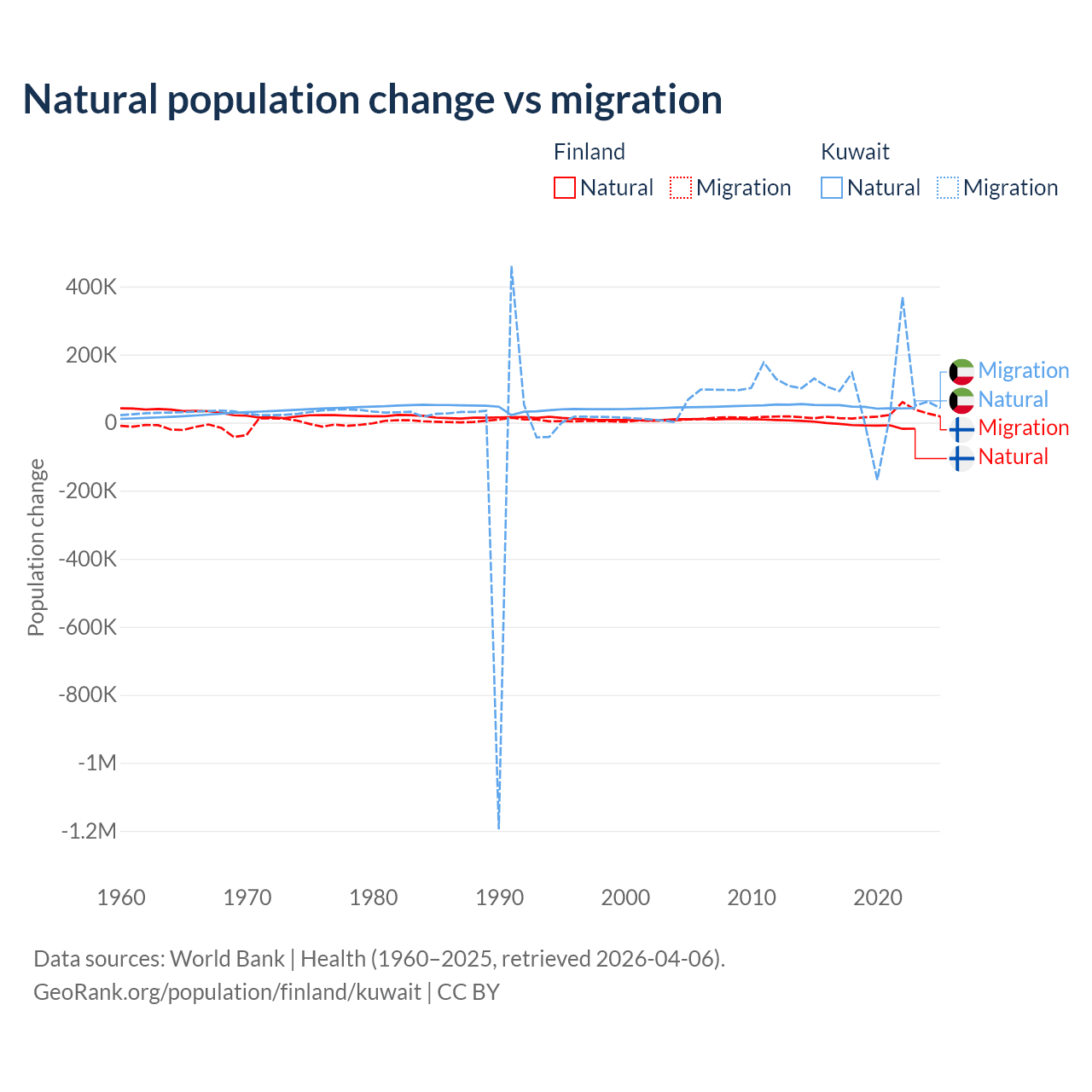 Over the last 10 years, 22.5% of the population change in Finland is from natural causes (a loss of 65,560 people) and 77.5% is from migration (a gain of 225,237 people). In Kuwait 35.8% is from natural causes (a gain of 470,645 people) and 64.2% is from migration (a gain of 845,142 people).