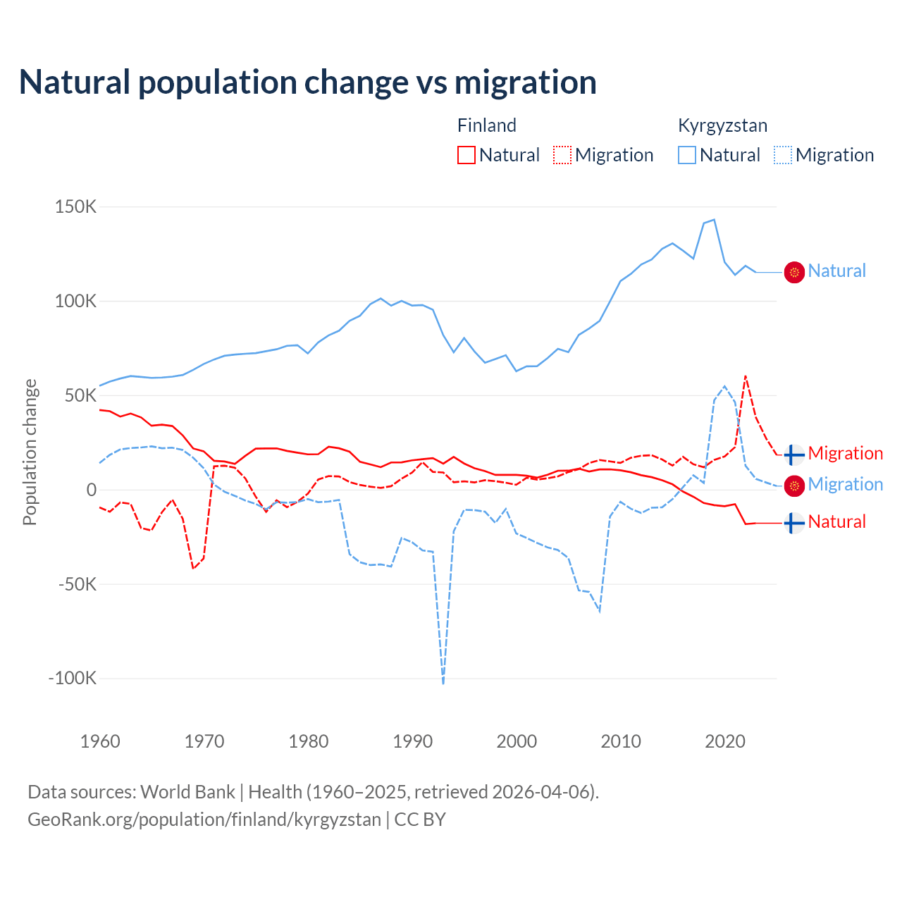 Over the last 10 years, 22.5% of the population change in Finland is from natural causes (a loss of 65,560 people) and 77.5% is from migration (a gain of 225,237 people). In Kyrgyzstan 88.5% is from natural causes (a gain of 1,258,837 people) and 11.5% is from migration (a gain of 164,132 people).
