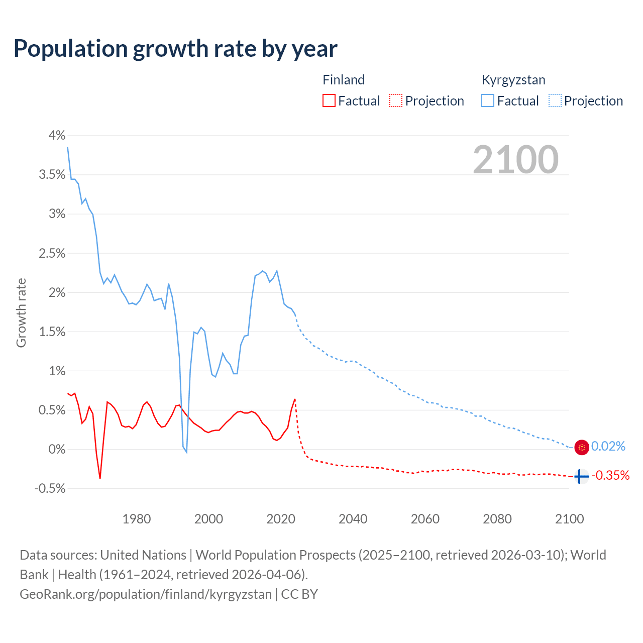- For the last 10 years, Finland has had an average growth rate of +0.3% per year vs +2.05% in Kyrgyzstan.