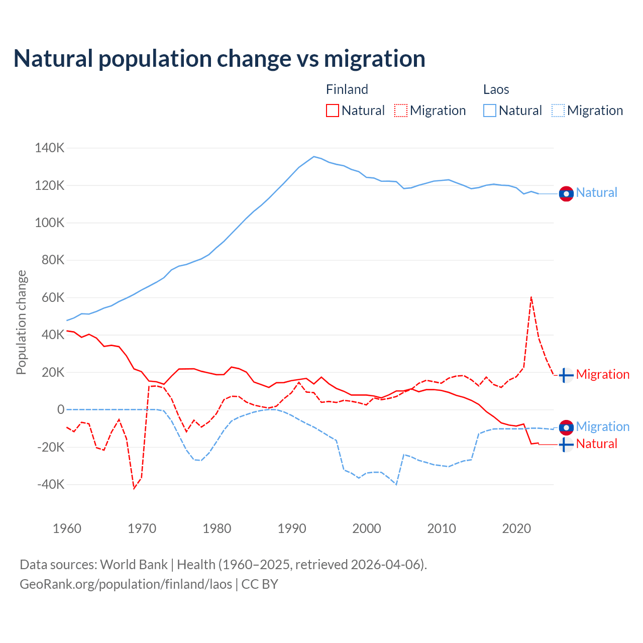 Over the last 10 years, 22.5% of the population change in Finland is from natural causes (a loss of 65,560 people) and 77.5% is from migration (a gain of 225,237 people). In Laos 90.6% is from natural causes (a gain of 1,183,013 people) and 9.41% is from migration (a loss of 122,899 people).