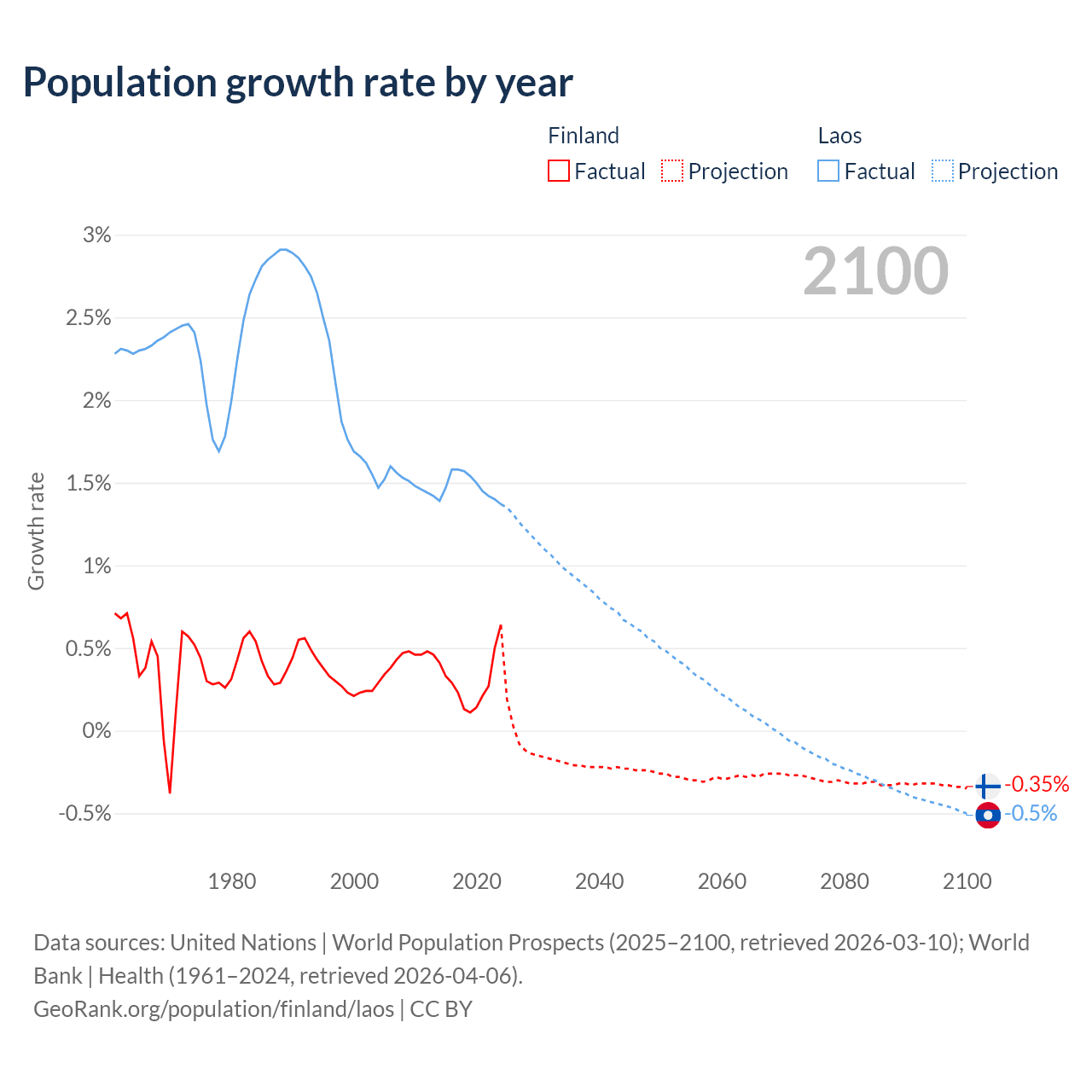 - For the last 10 years, Finland has had an average growth rate of +0.3% per year vs +1.48% in Laos.
