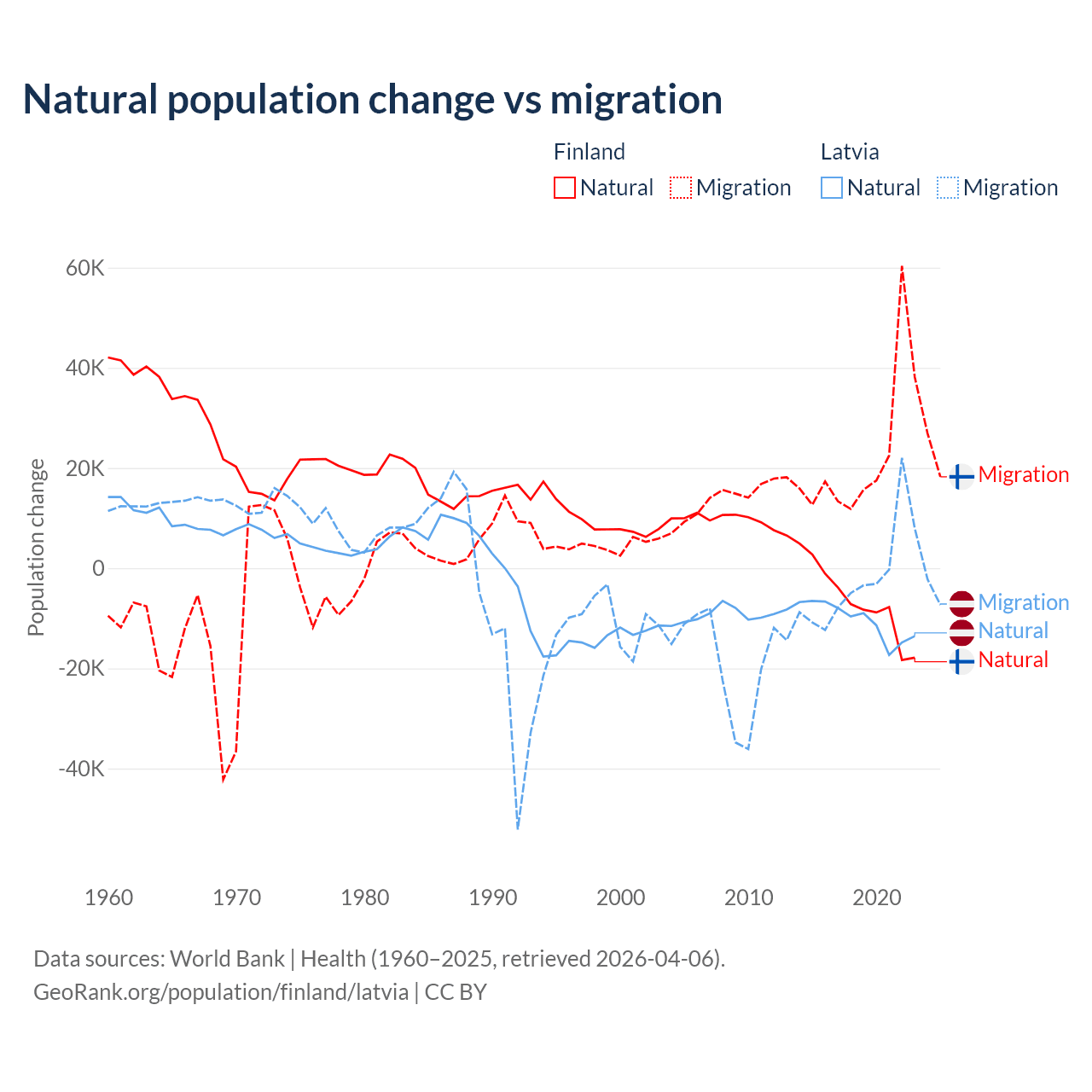 Over the last 10 years, 22.5% of the population change in Finland is from natural causes (a loss of 65,560 people) and 77.5% is from migration (a gain of 225,237 people). In Latvia 82.7% is from natural causes (a loss of 103,711 people) and 17.3% is from migration (a loss of 21,641 people).