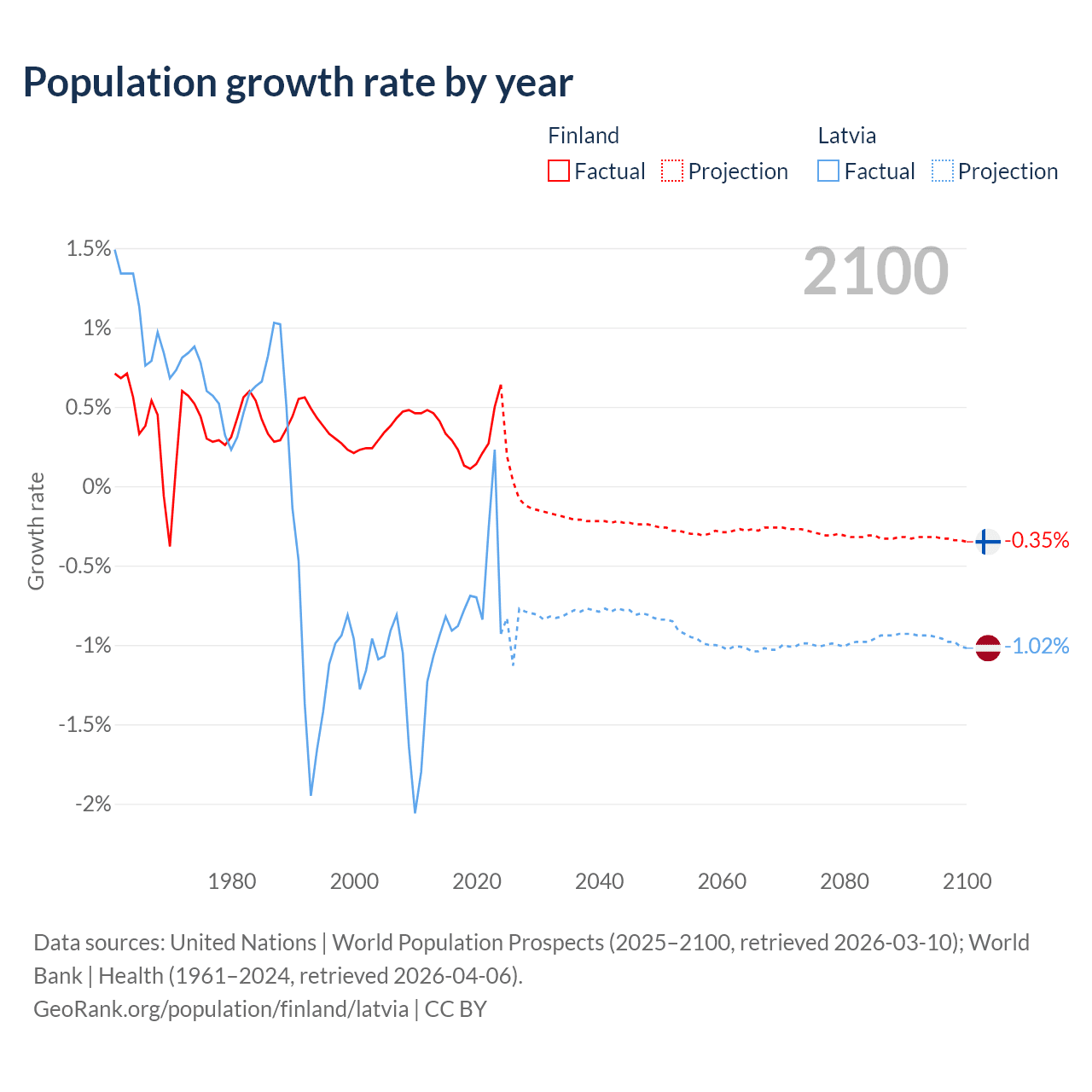 - For the last 10 years, Finland has had an average growth rate of +0.3% per year vs -0.68% in Latvia.