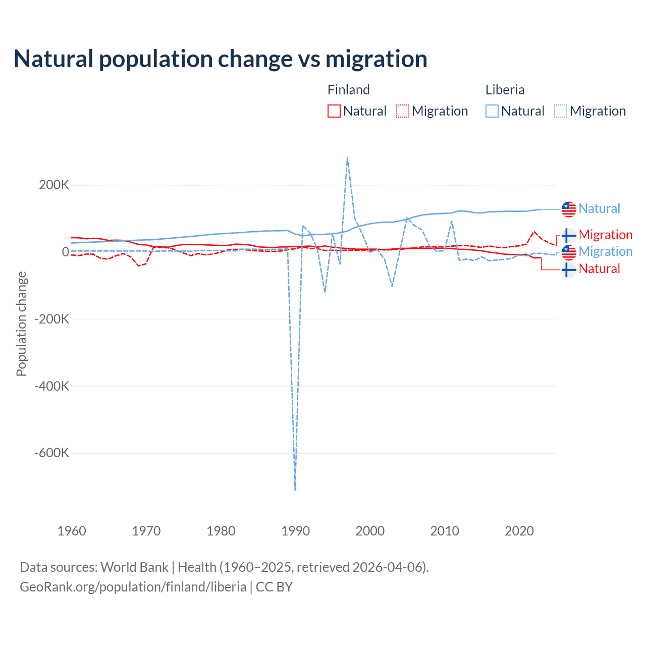 Over the last 10 years, 22.5% of the population change in Finland is from natural causes (a loss of 65,560 people) and 77.5% is from migration (a gain of 225,237 people). In Liberia 87.7% is from natural causes (a gain of 1,202,387 people) and 12.3% is from migration (a loss of 168,316 people).